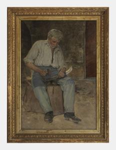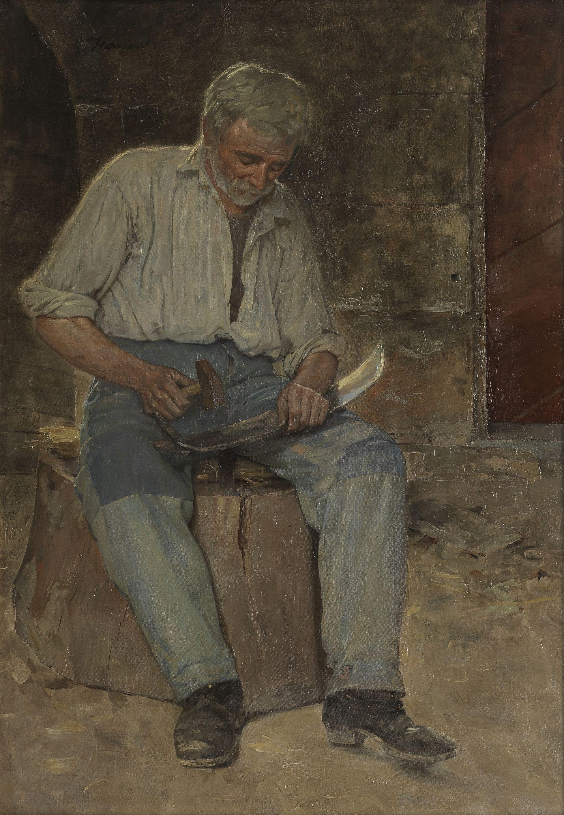 Paysan aiguisant sa faucille, huile sur toile, signée, 70x50 cm