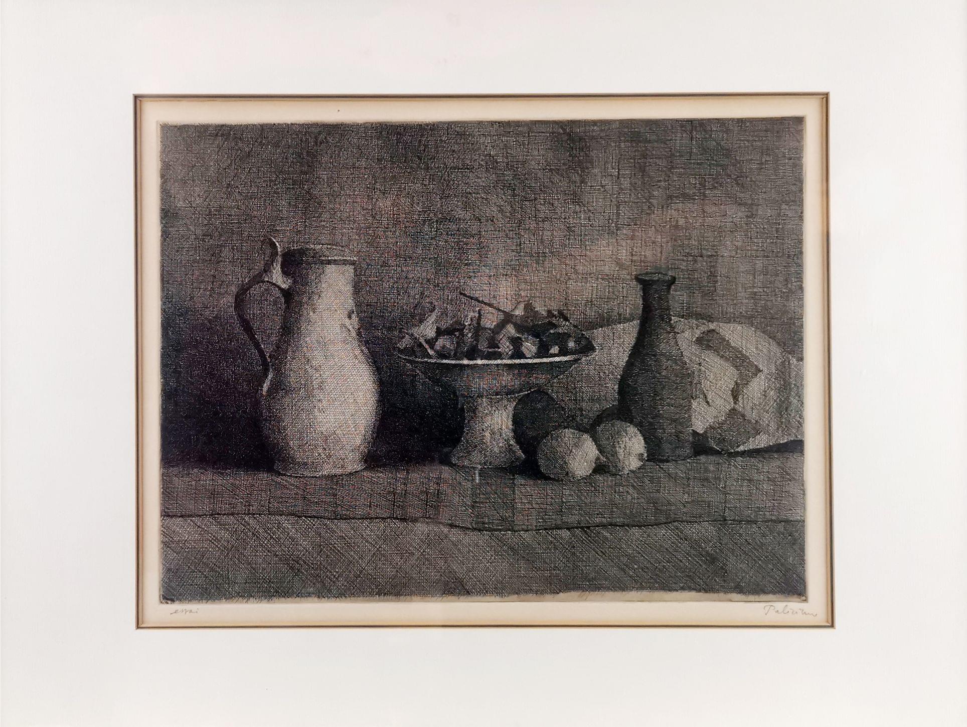Nature morte au pichet et à la coupe de fruits, eau-forte, signée, 32x42 cm