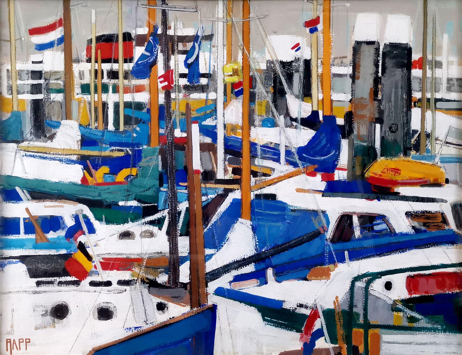 Bateaux au port, gouache sur papier, signée, 48x62 cm