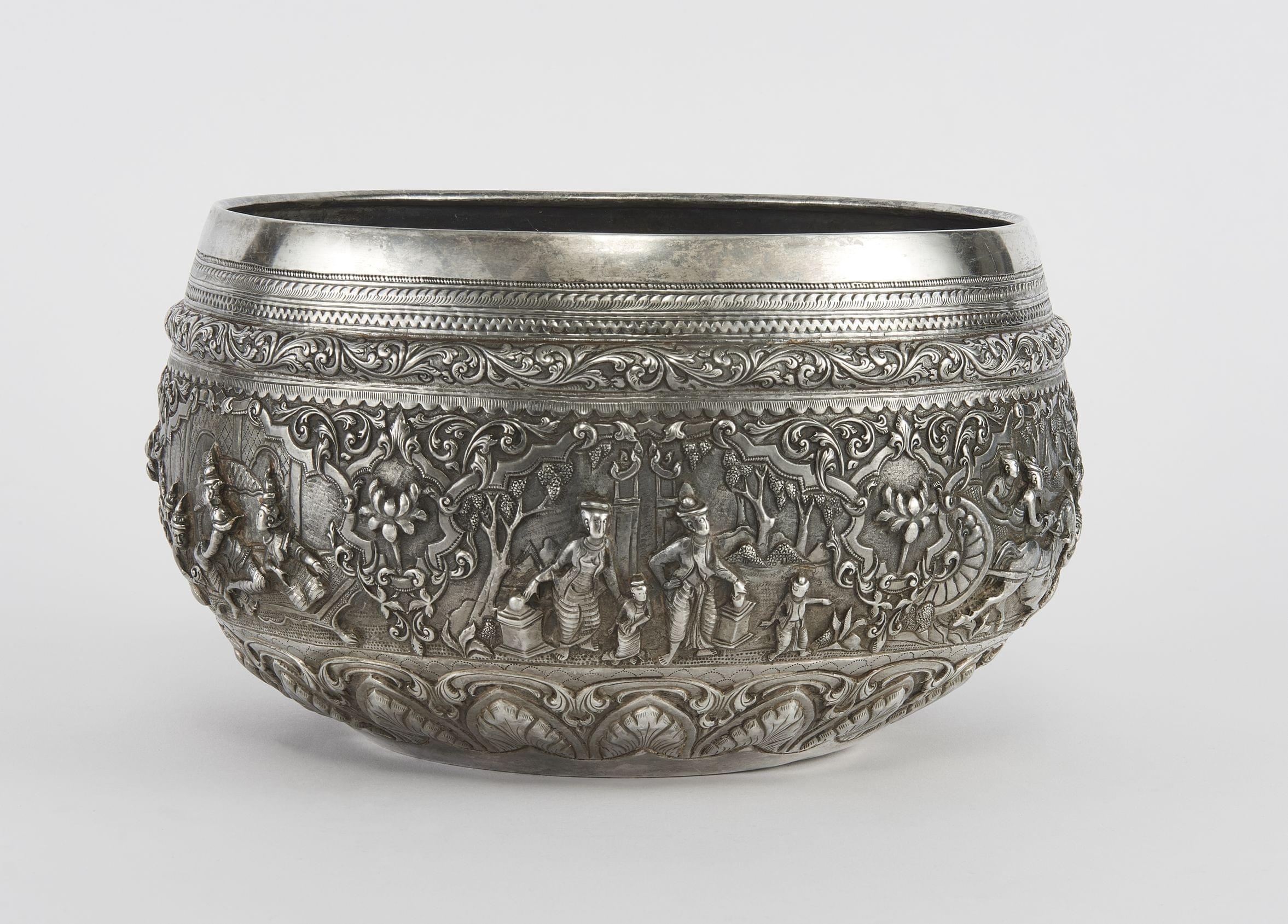 A décor repoussé de scènes animées, vendeur Coombes & Co, Rangoon & London, argent , 13x22 cm, 800 g