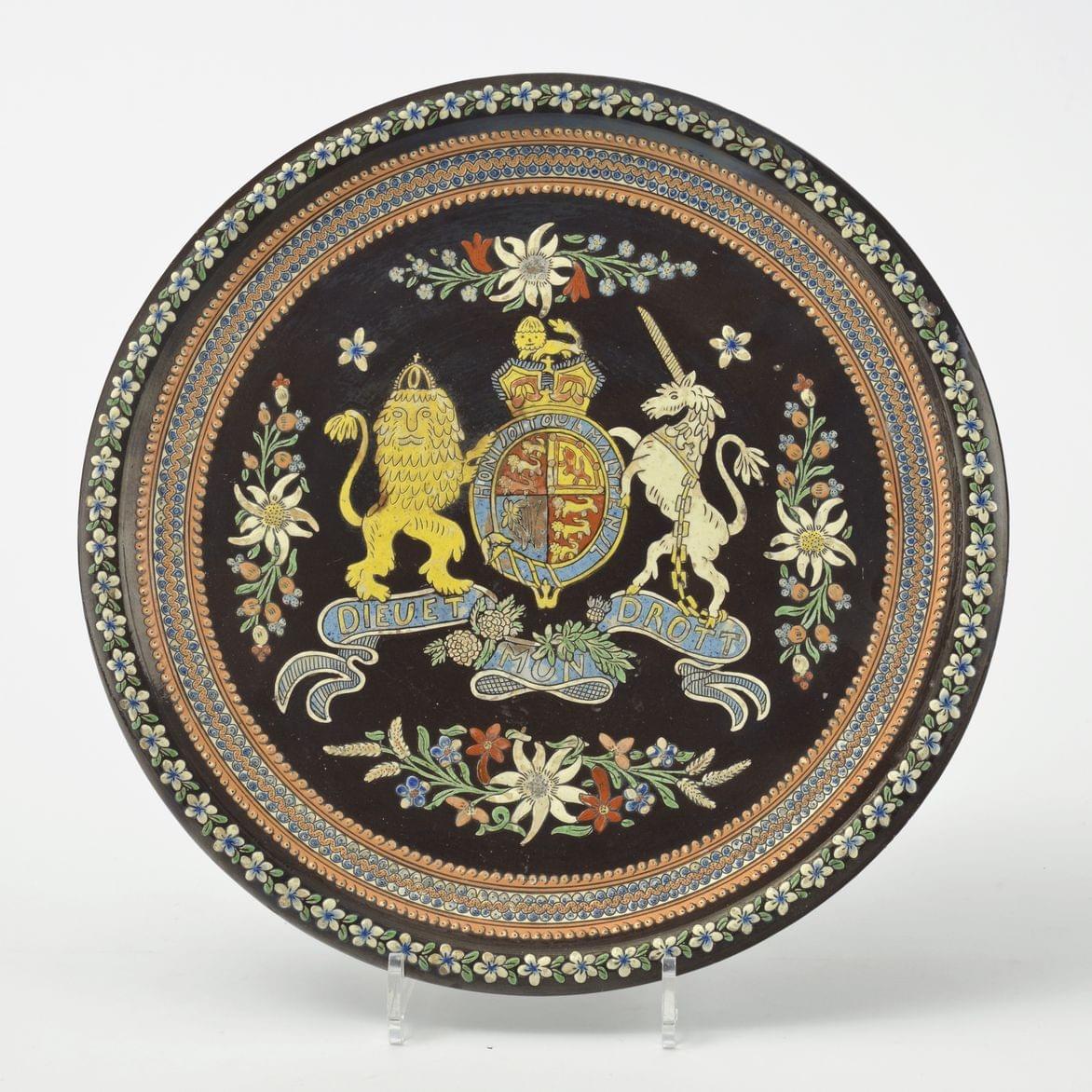 Terre vernissée à décor central aux armoiries de la couronne d'Angleterre, fond brun, signature "Thoune", D 35,5cm.