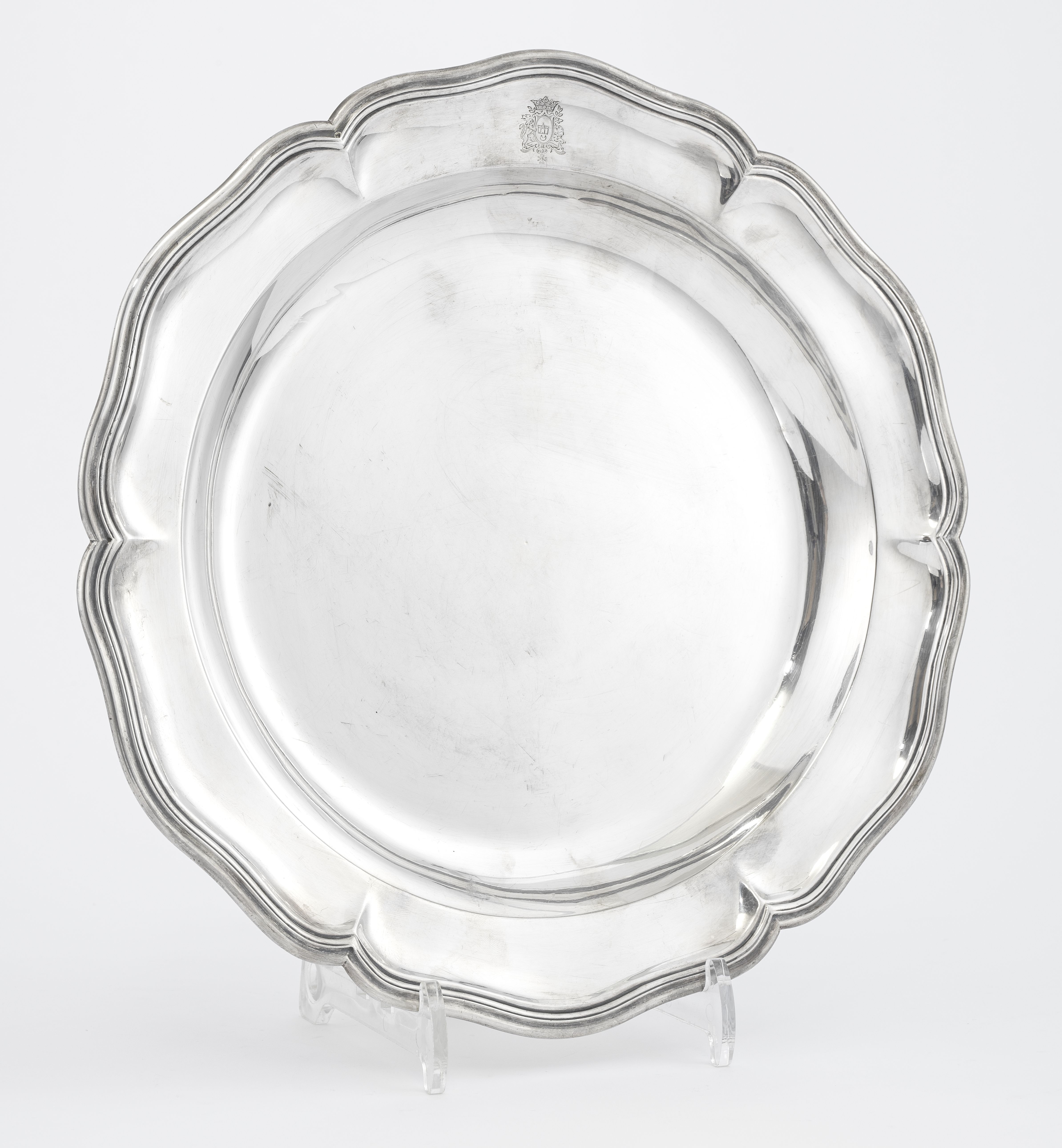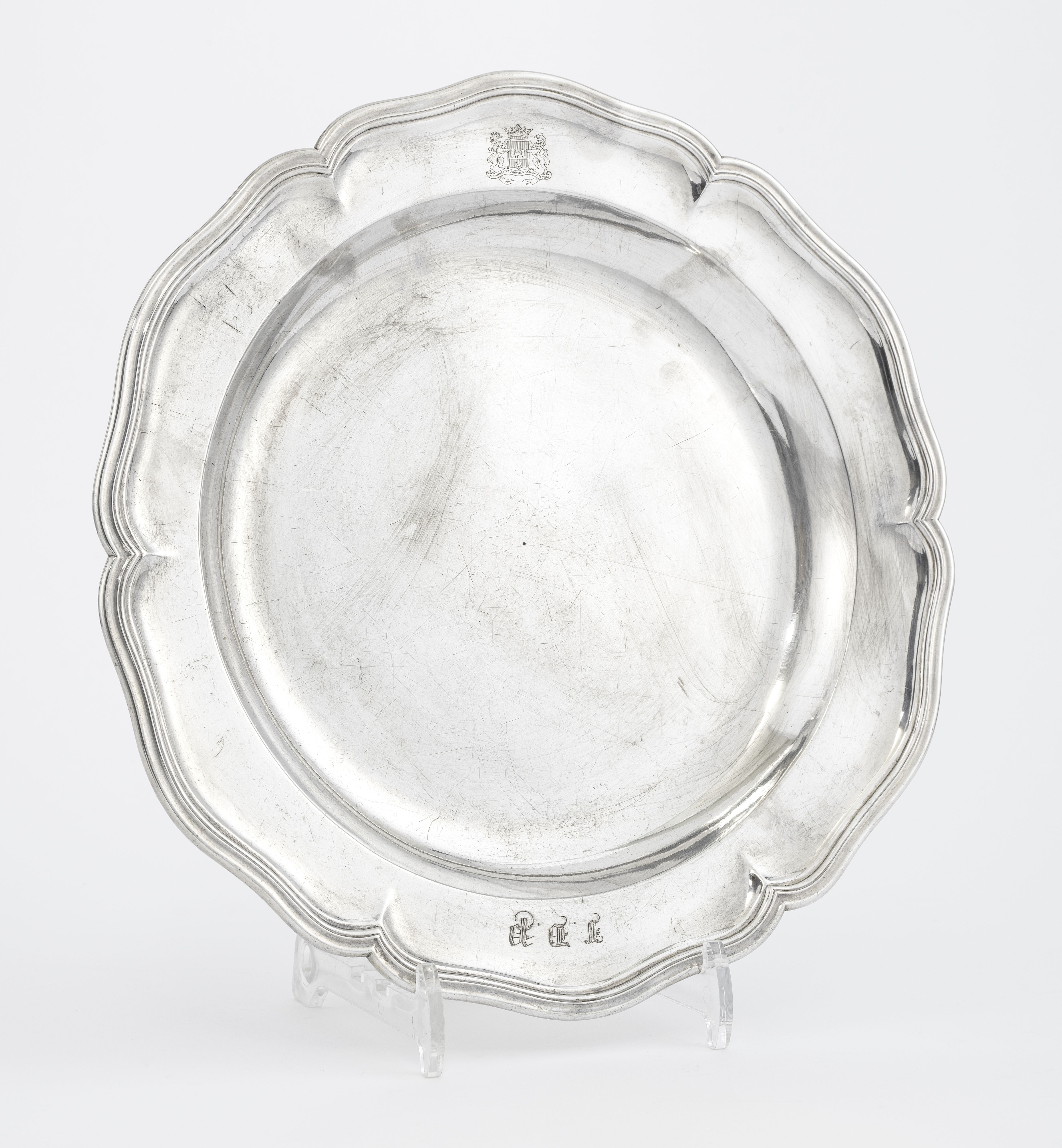 3570. Plat rond festonné monogrammé IDP et armorié Lullin