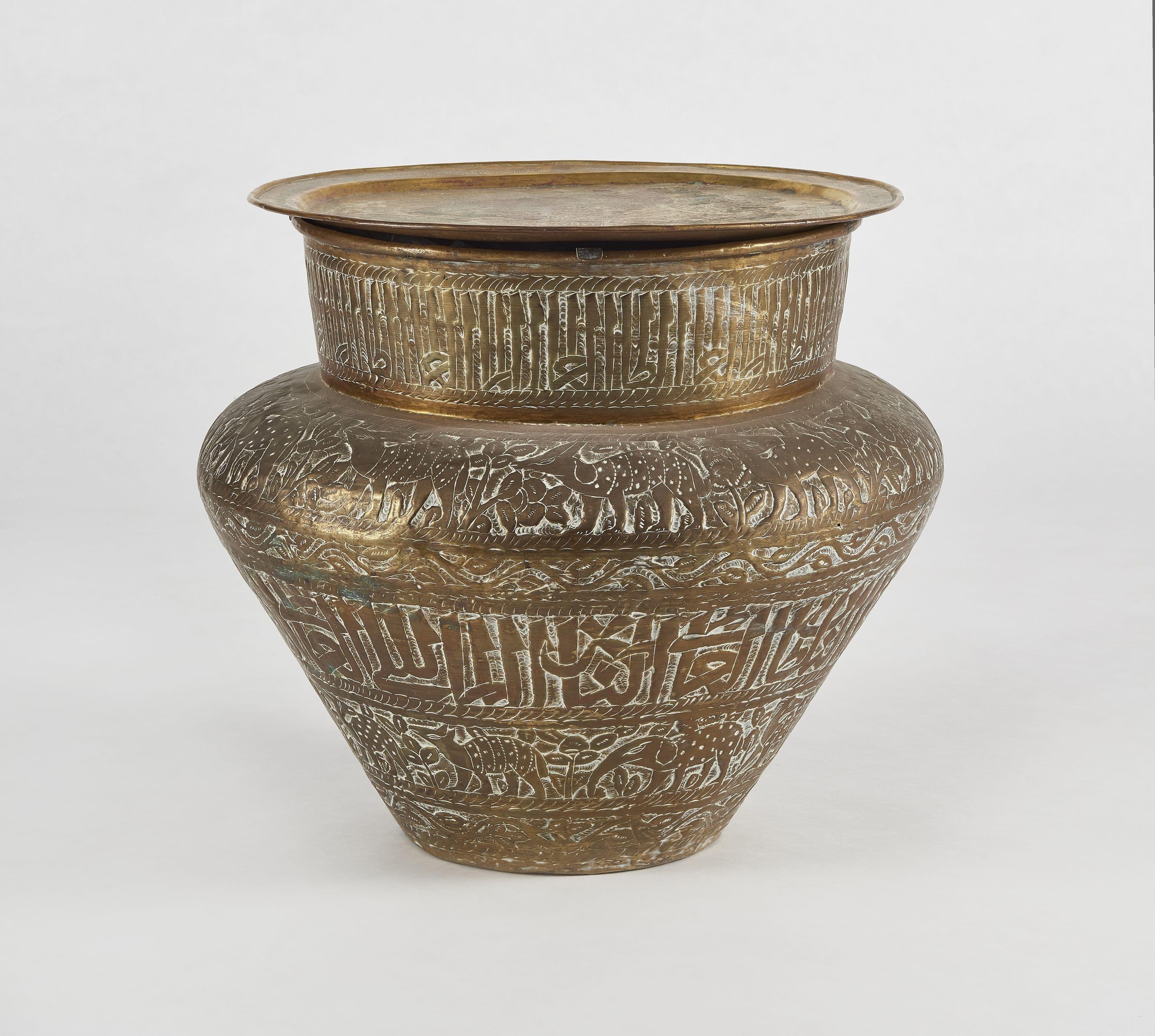 Cuivre à décor au repoussé de frises d'animaux et calligraphies, H 55 cm. On joint un plateau.