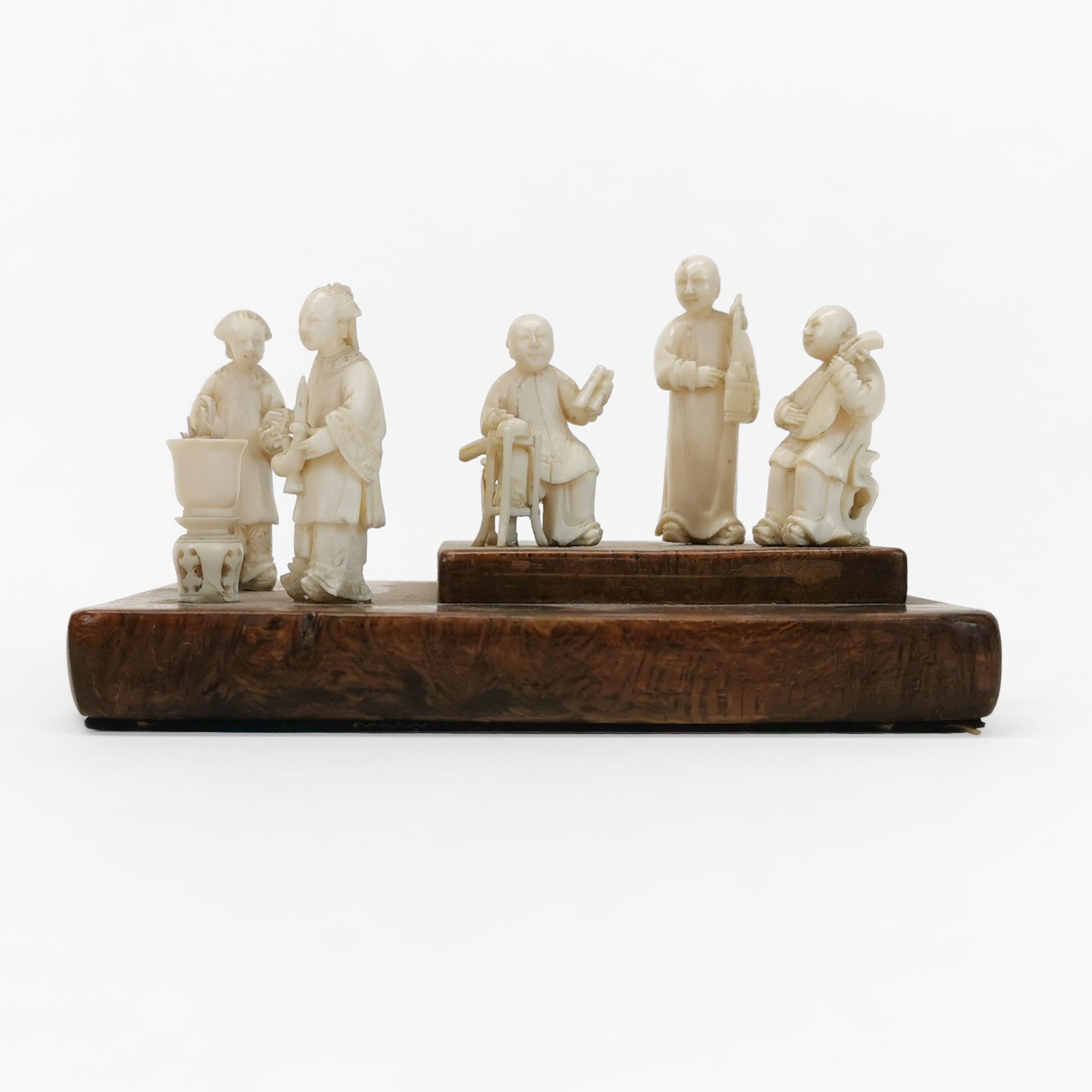 Sujets en ivoire, socle en bois, H personnages 4 cm