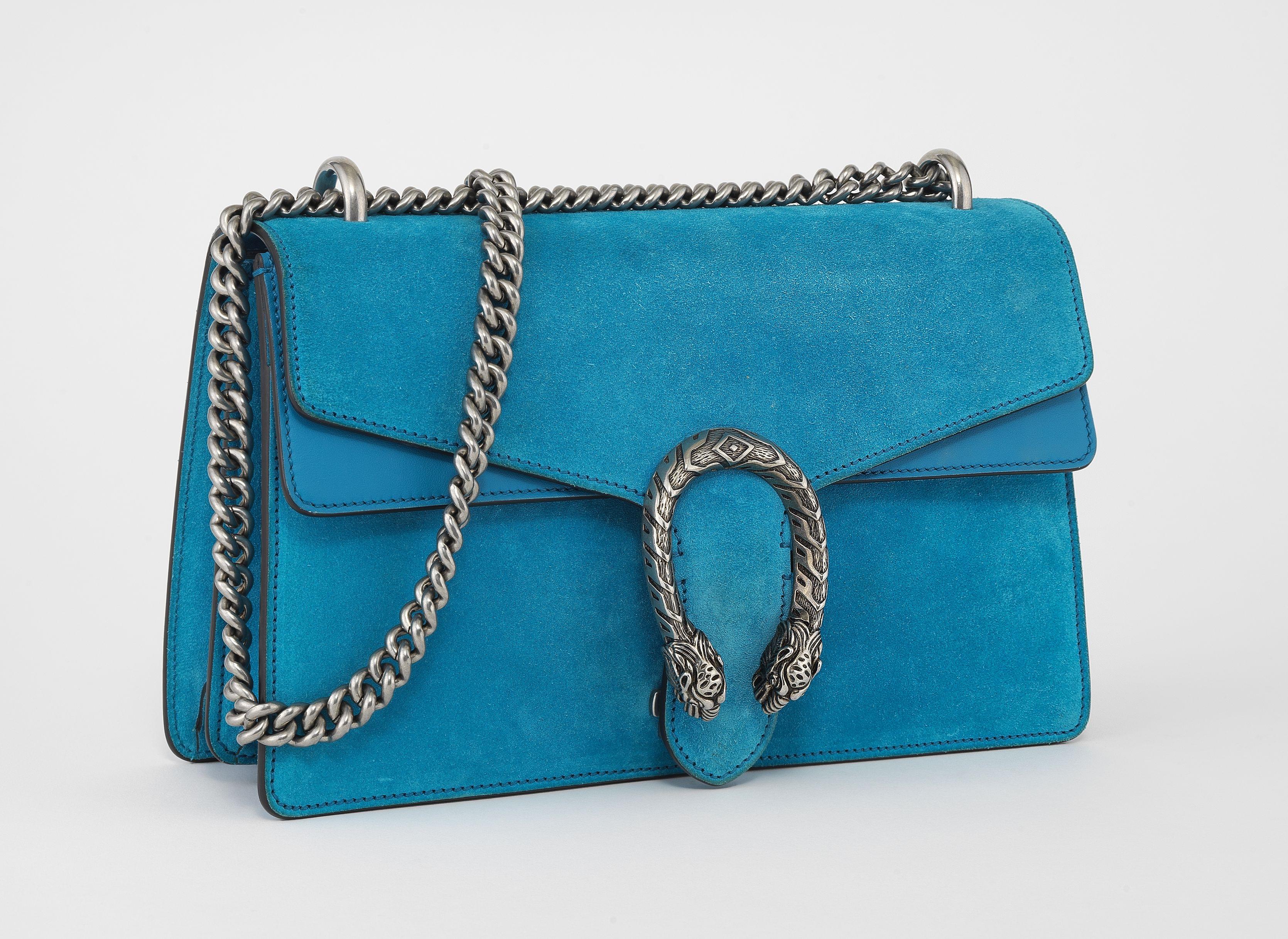 Daim et cuir bleu turquoise, fermeture à rabat stylisée de deux têtes de tigre avec anneau, intérieur en deux soufflets avec une poche centrale zippée, anse en métal argenté maille gourmette, 17x27x8 cm