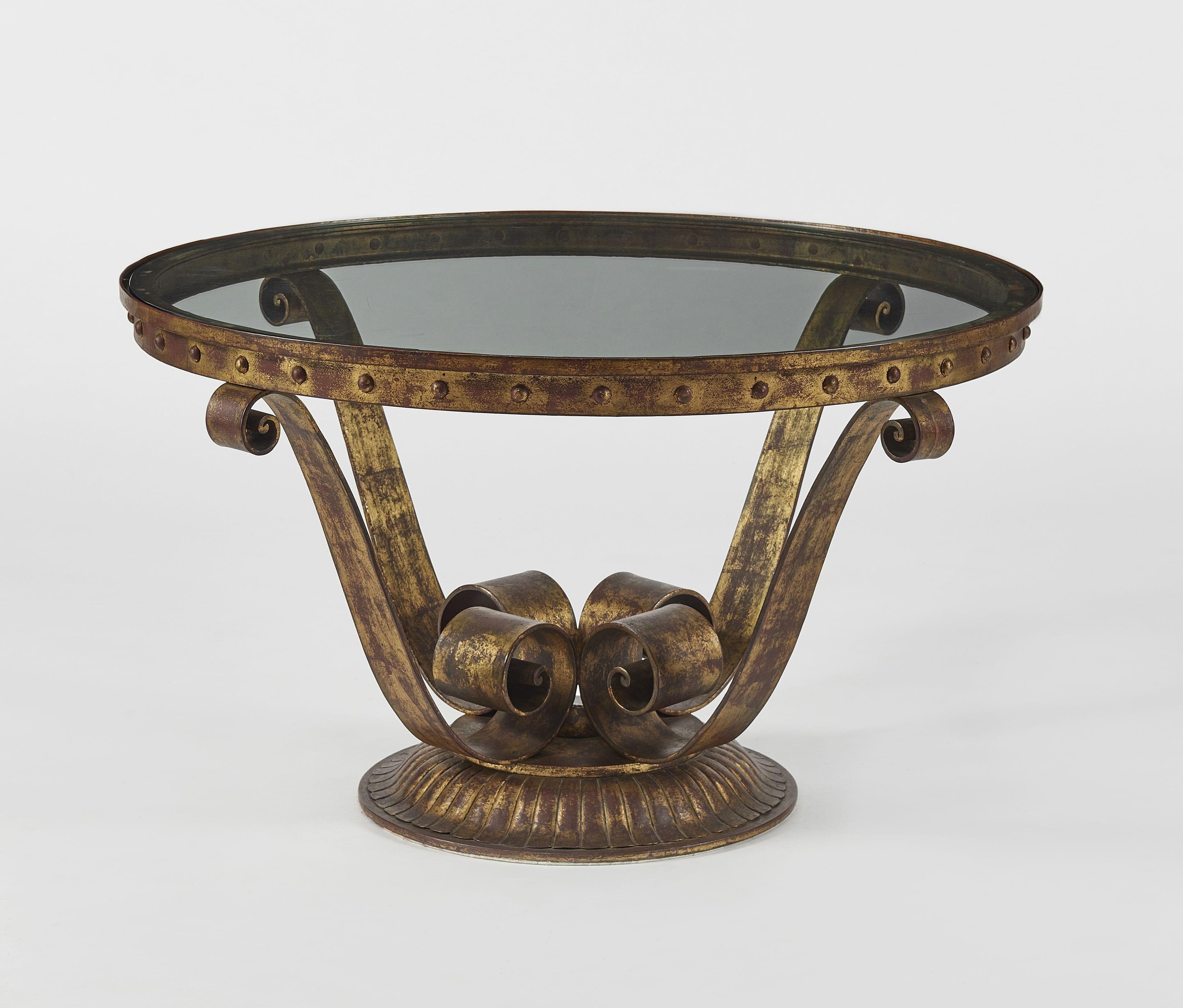 Fer forgé partiellement doré à décor de volutes, plateau de verre, 57x95 cm
