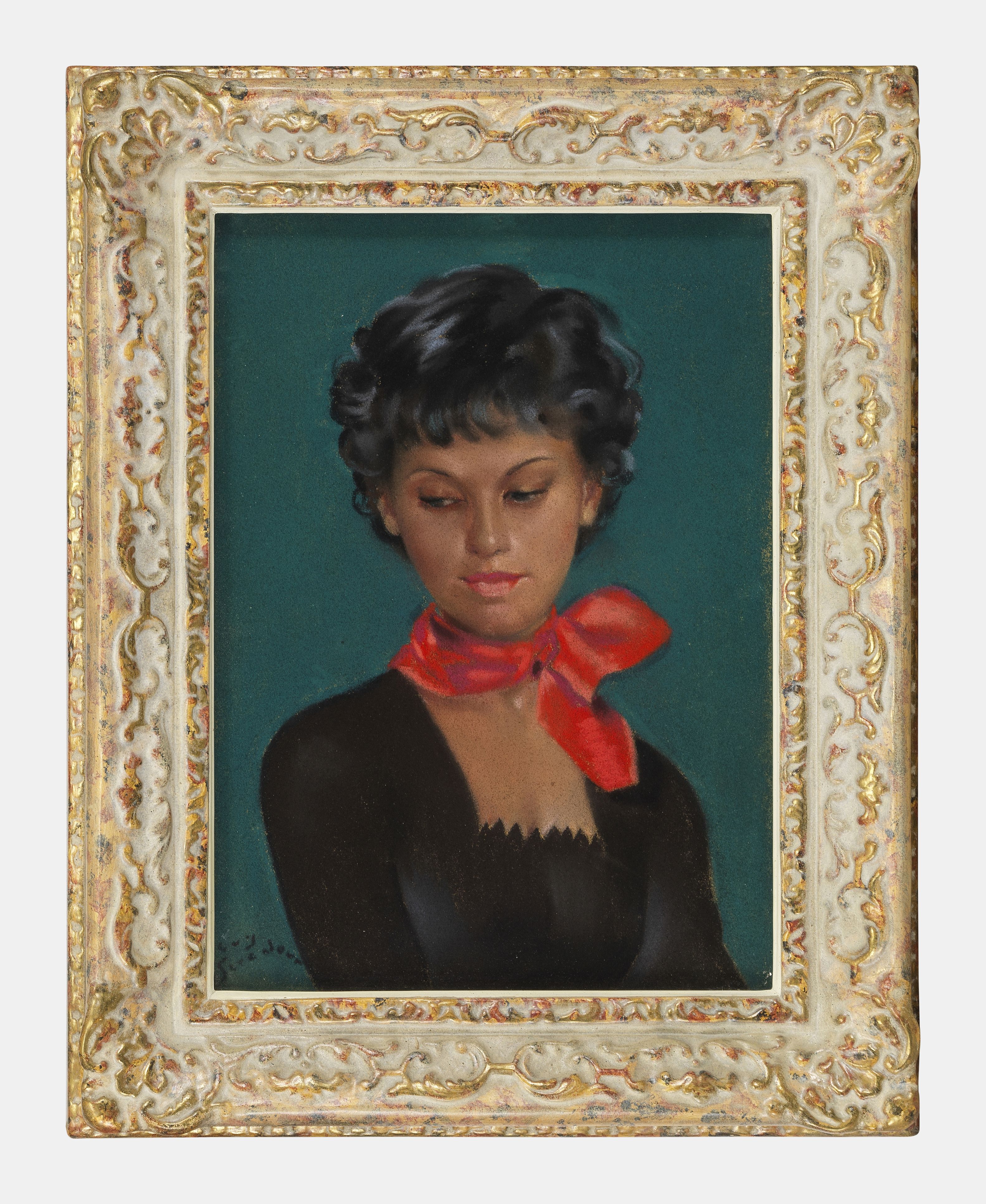 Jeune femme à l'écharpe rouge, pastel sur papier, signé, 32x23 cm