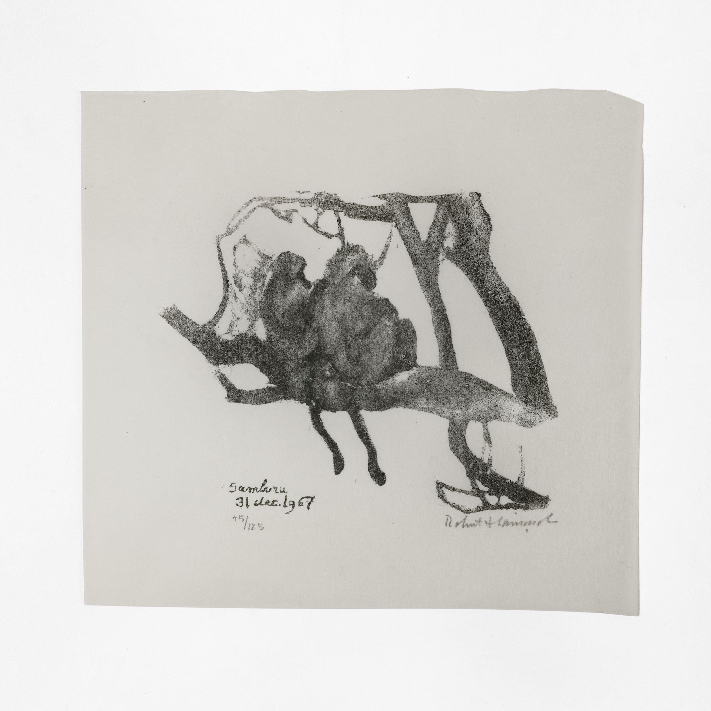 5053. - HAINARD (Robert) : Croquis d’Afrique. Saint-Claude-de-Diray, Ed. Hesse, 1989 ;in 4°, percaline grise, sous jaquette ill. Nomb. croquis dans le texte. Un des 125 ex. num., comprenant une gravure sur bois signée et numérotée (deux vervets se pouillant), il porte le n° 45.