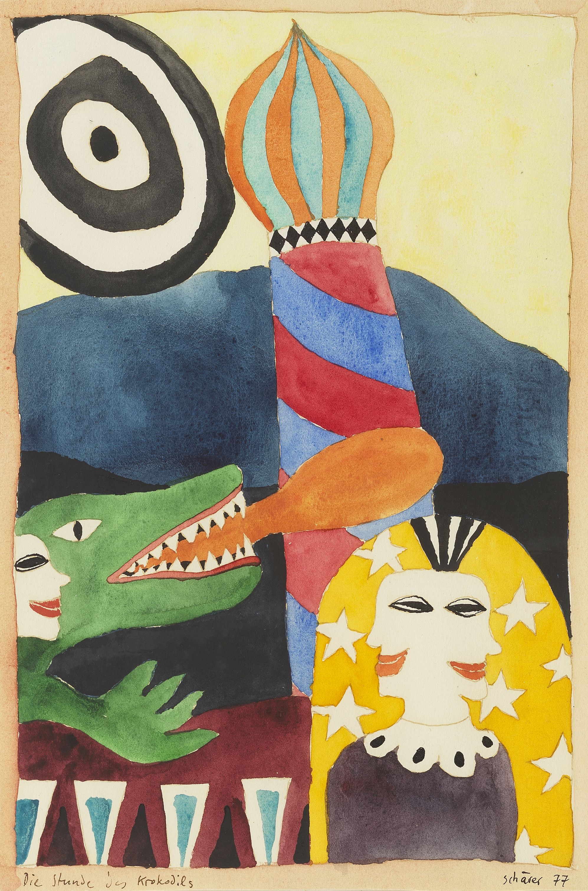 L'heure du crocodile, aquarelle sur papier, signée et datée 77,...