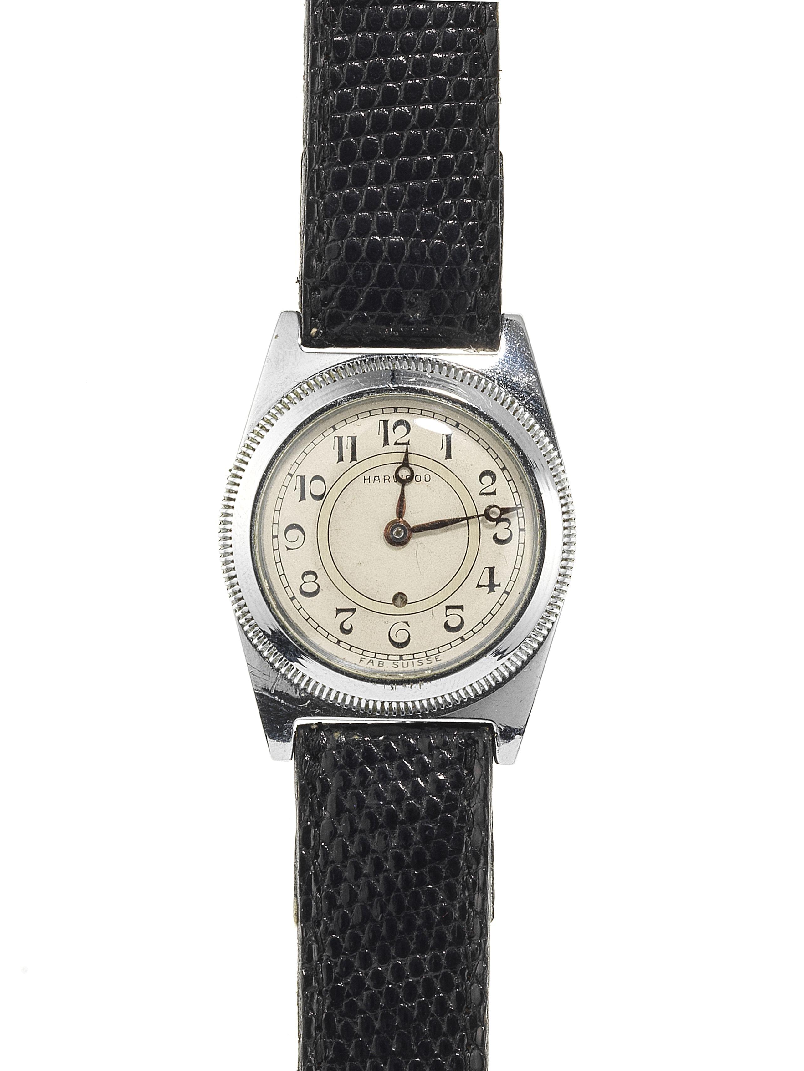 Cadran gris, aiguilles bronze, chiffres arabes et chemin de fer noirs, réglage de l'heure par la lunette tournante, absence de couronne, première montre automatique de poignet (circa 1930), acier, D 28 mm