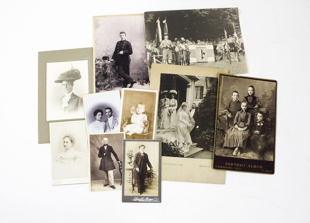 Important ensemble d'environ 150 photographies anciennes, personnages, Genève et Suisse, circa 1880-1900, de 9,5x6cm à 20x13,5cm