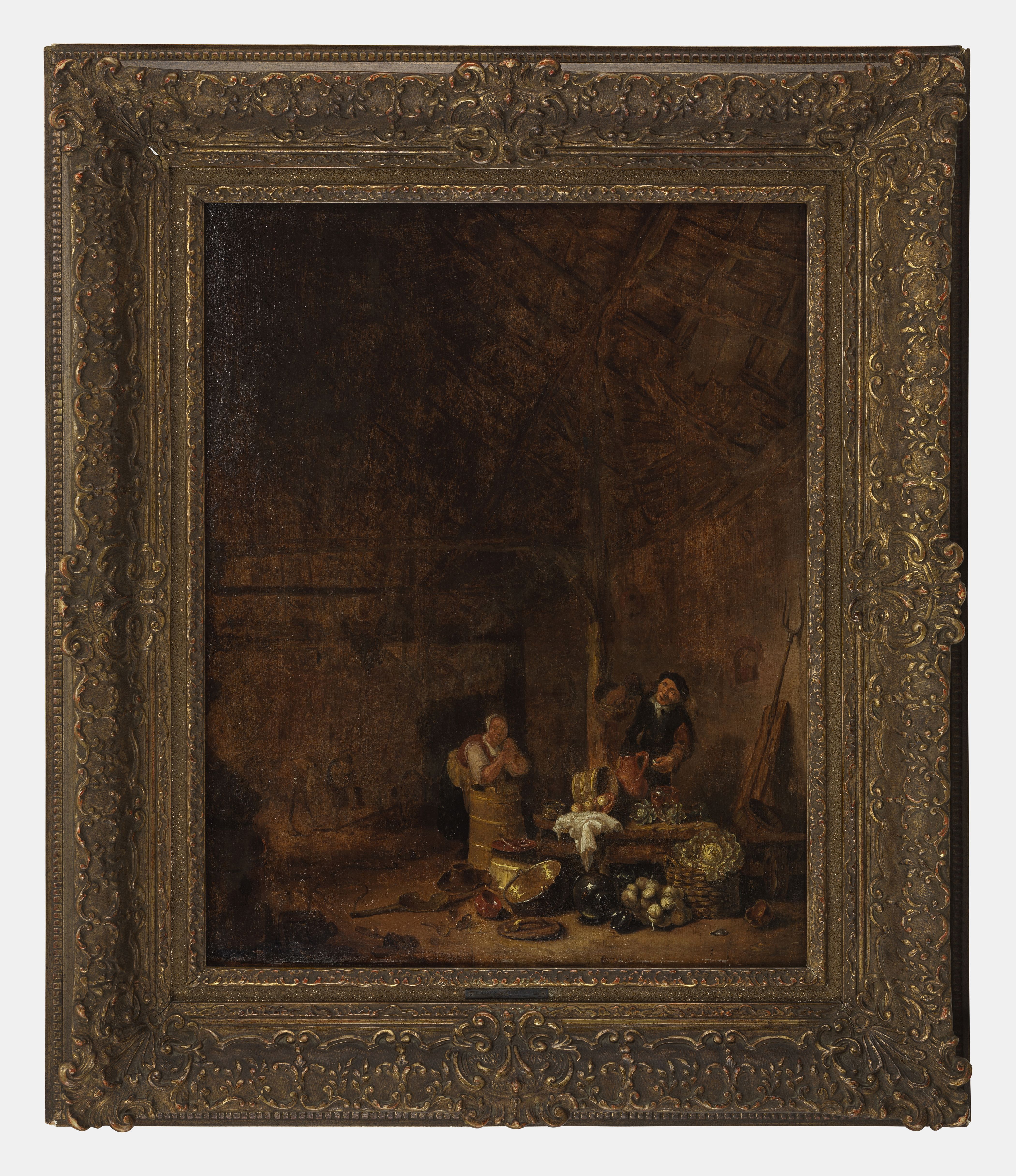 Scène animée dans une grange, huile sur panneau, 65x50 cm