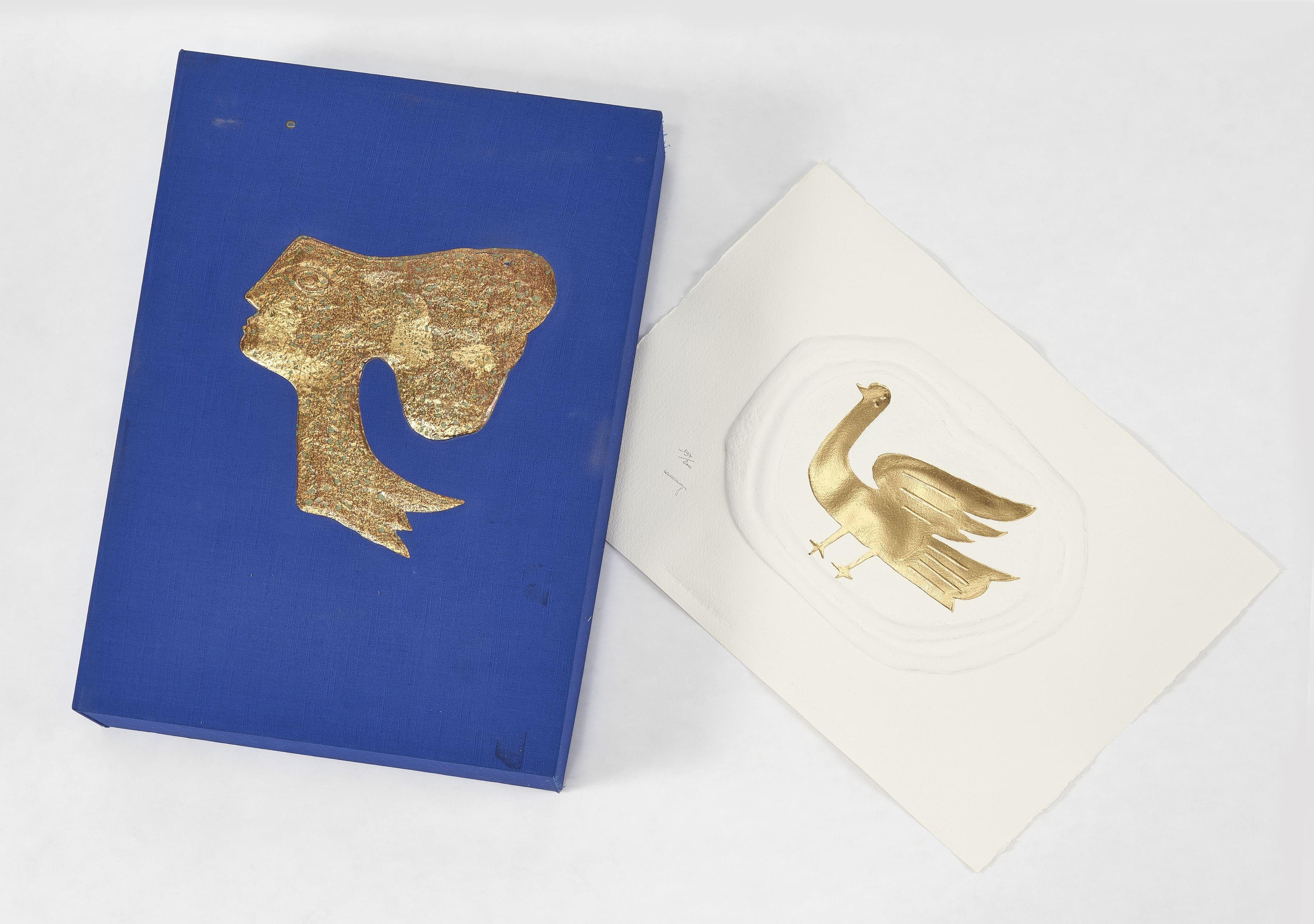Hommage aux bijoux de Braque, suite de neuf estampes gaufrées, dorées, numérotées et signées, sous emboîtage, 38x58 cm