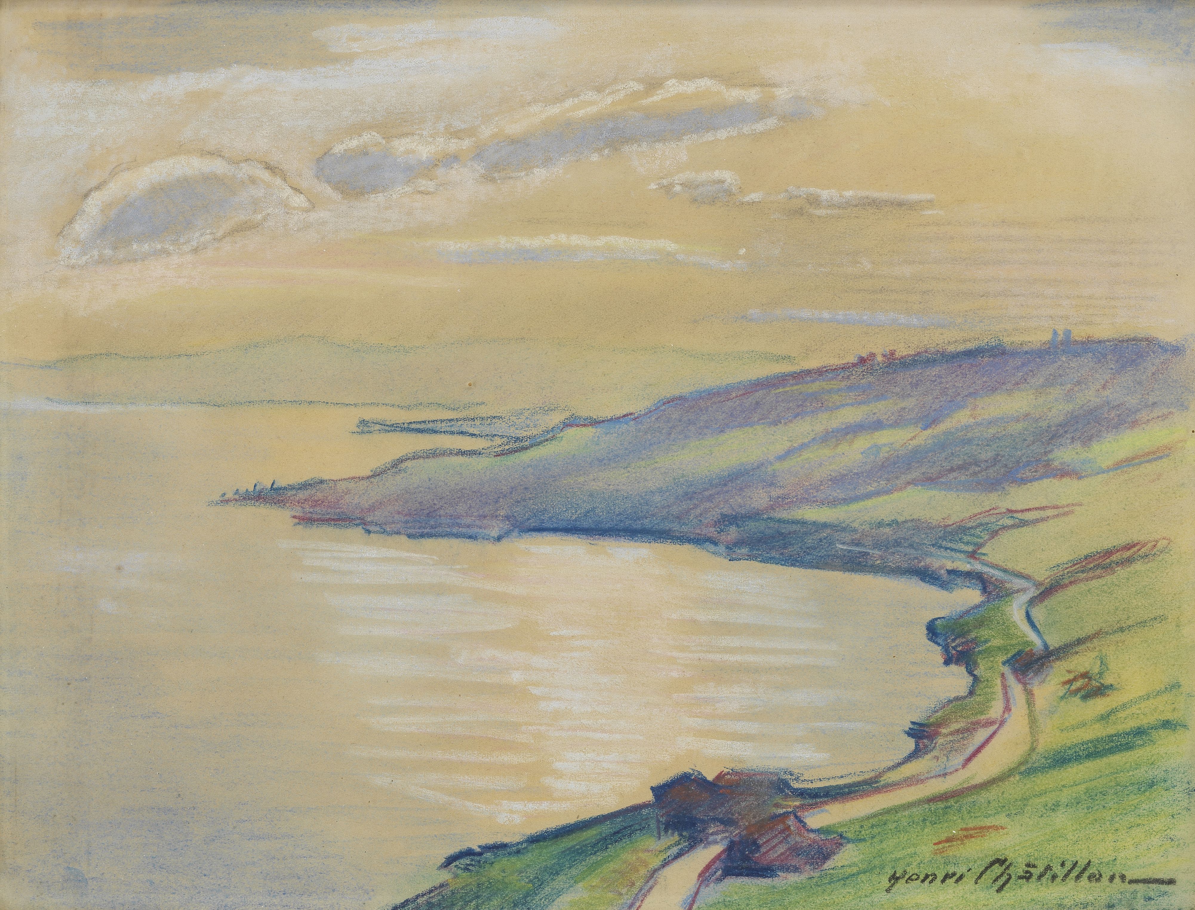 Vue d'Yvoire, crayon et gouache sur papier, monogrammé et daté 1...