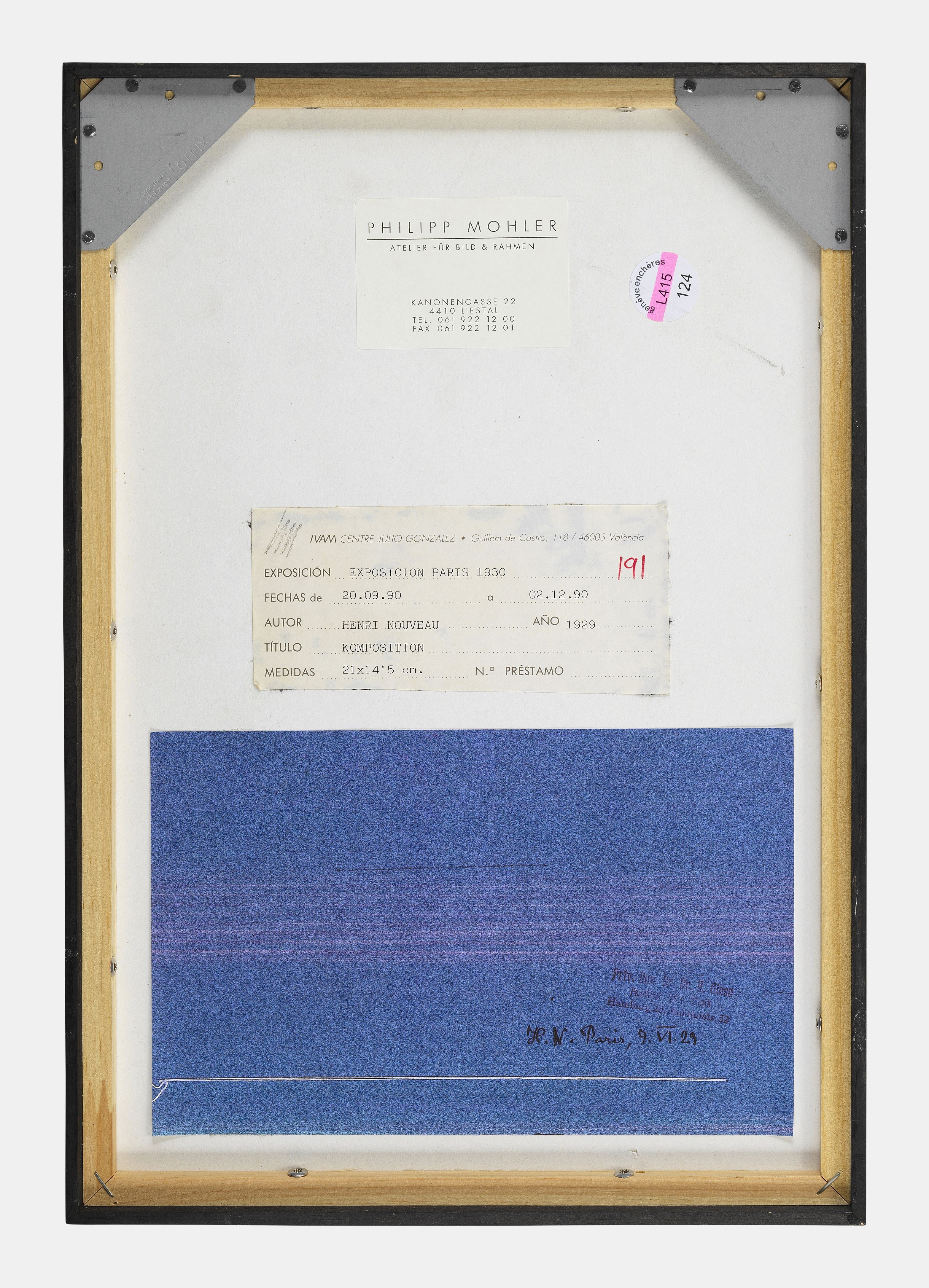 Composition cubiste abstraite, monogrammée, située Paris et datée 9 juin 29 au dos, 21x14,5 cm. Provenance galerie Philippe Mohler, centre Julio Gonzales Valencia