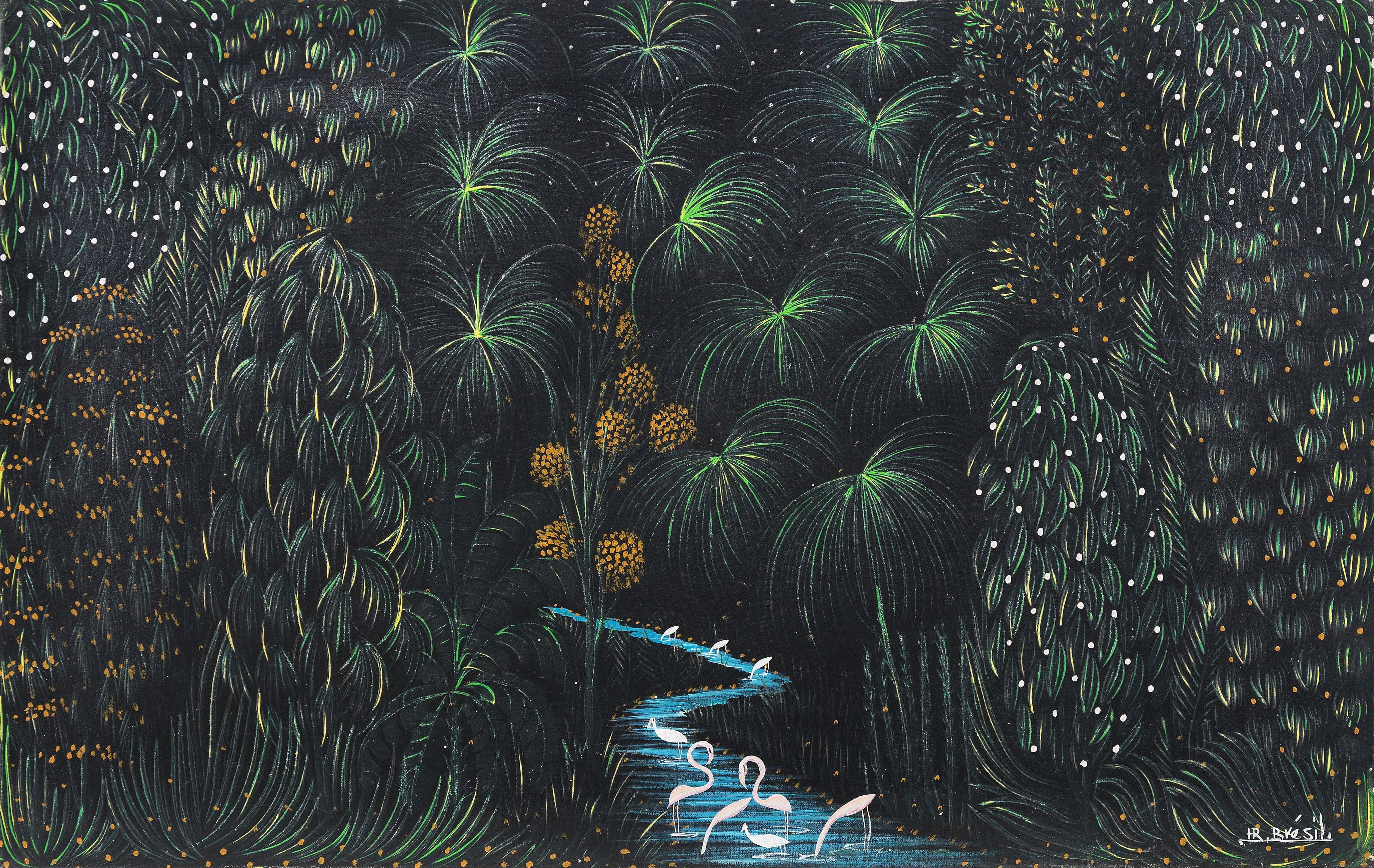 Paysage de rivière et flamants roses, huile sur toile, signée, 51x76 cm
