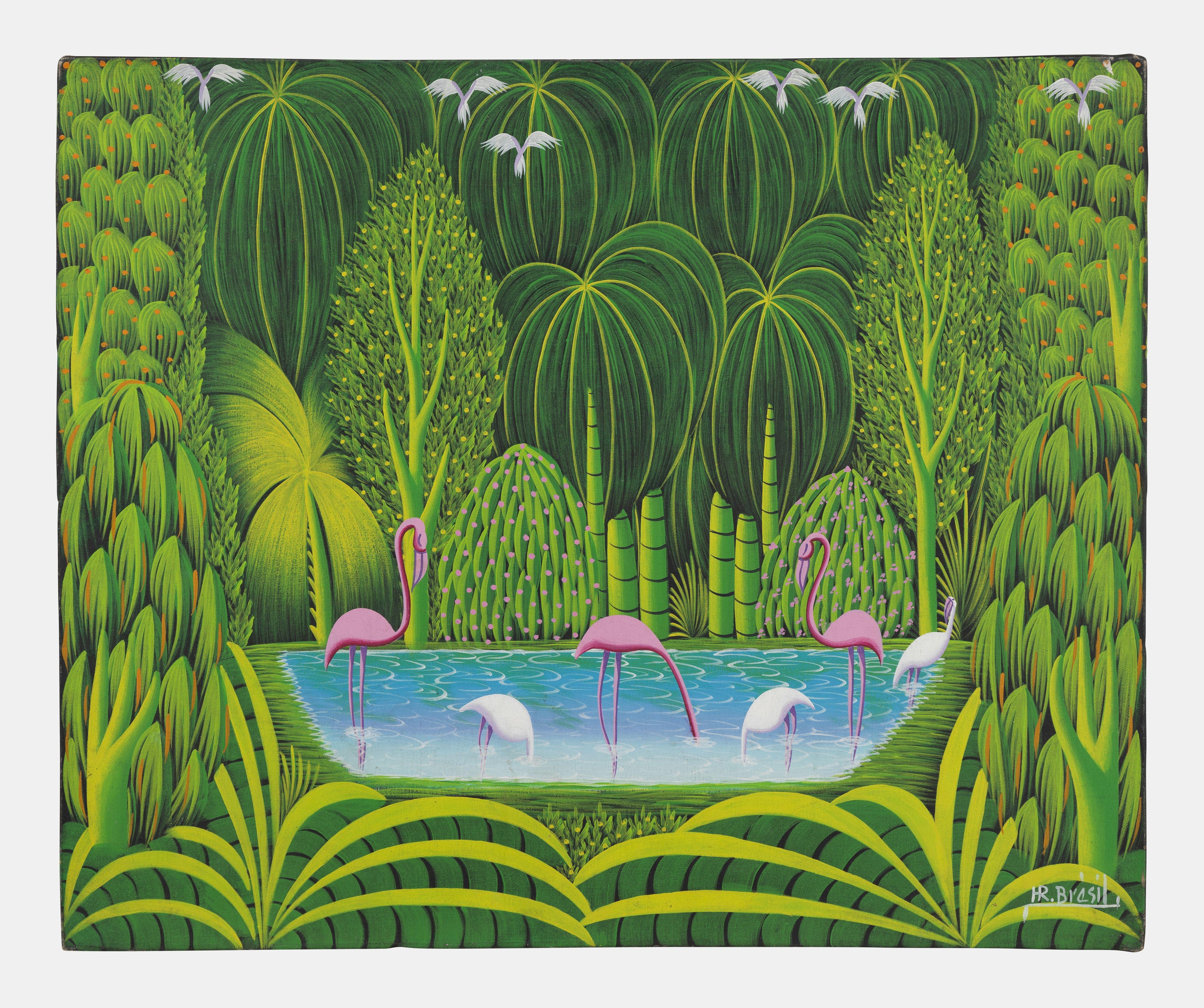 Paysage avec des flamands roses, huile sur toile, signée, 51x61 cm
