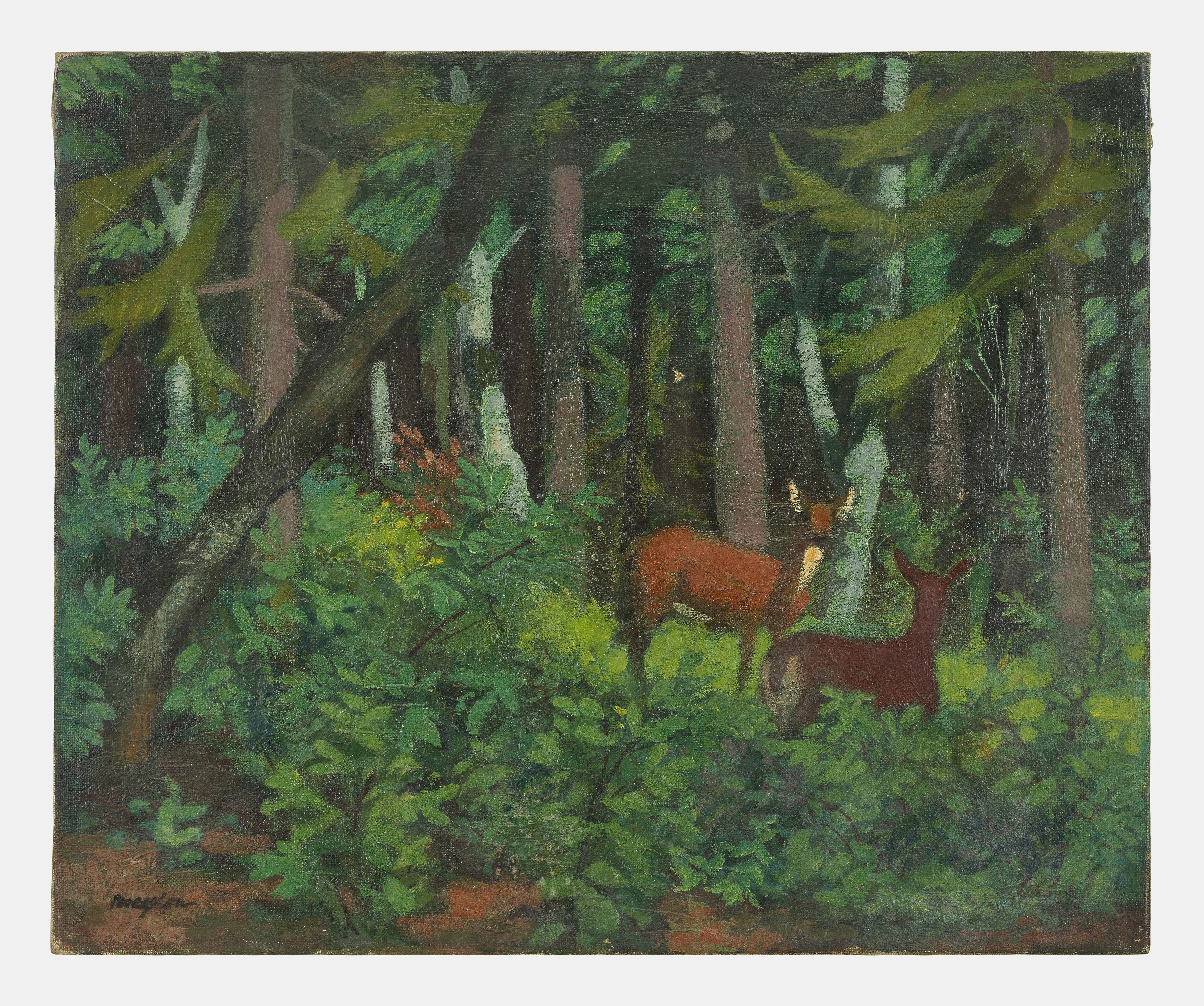 Biches aux aguets, huile sur toile, signée, 60x73 cm