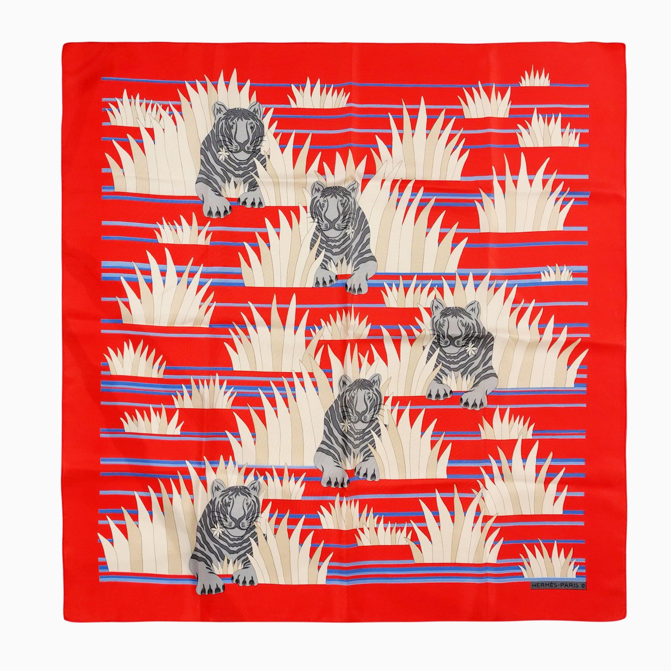 A décor de tigres sur fond ivoire, bleu et orange, soie, env. 88x88 cm