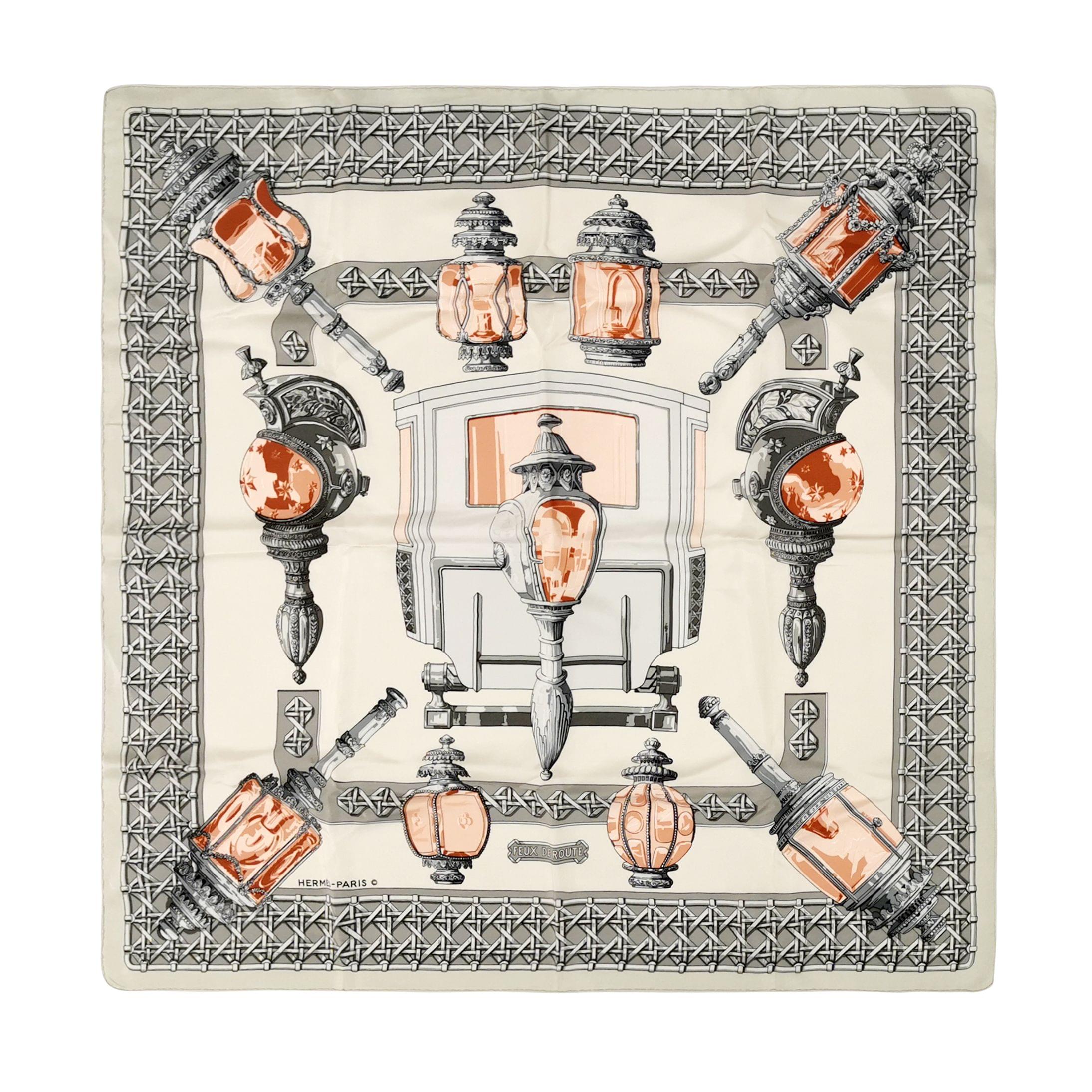 A décor de lanternes de rue sur fond beige et bordure gris perle, soie, 85x85 cm env.