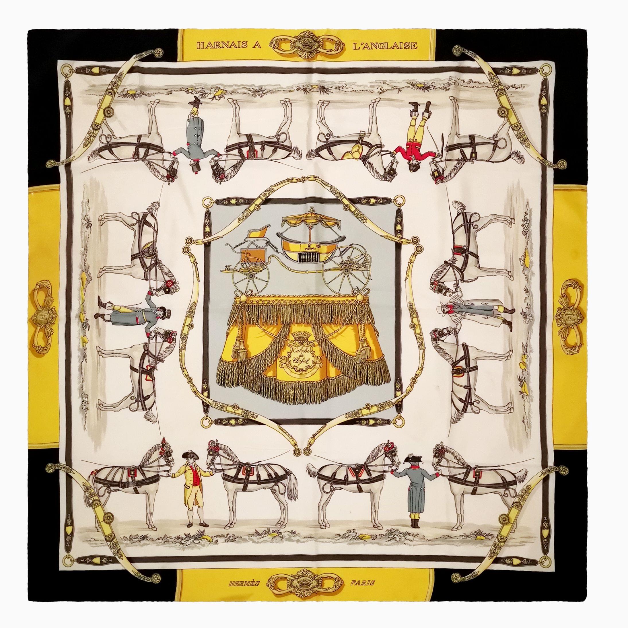 A décor de chevaux d'attelage, calèches sur fond ivoire et bordure chocolat, soie, 88x88 cm. Dans sa boîte