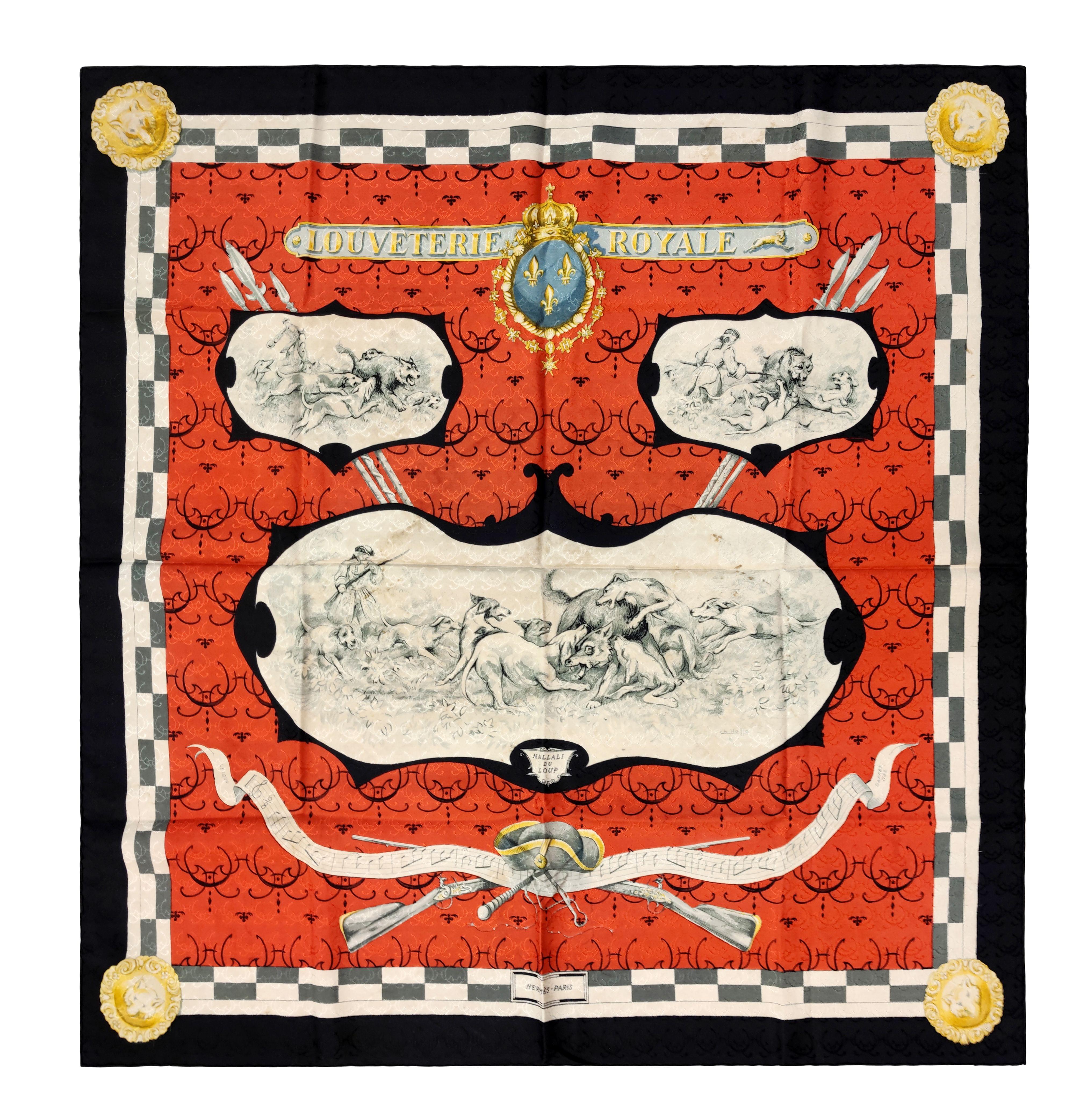 A décor de chasse au loup sur fond rouge, beige et bordure noire, soie, 85x89 cm