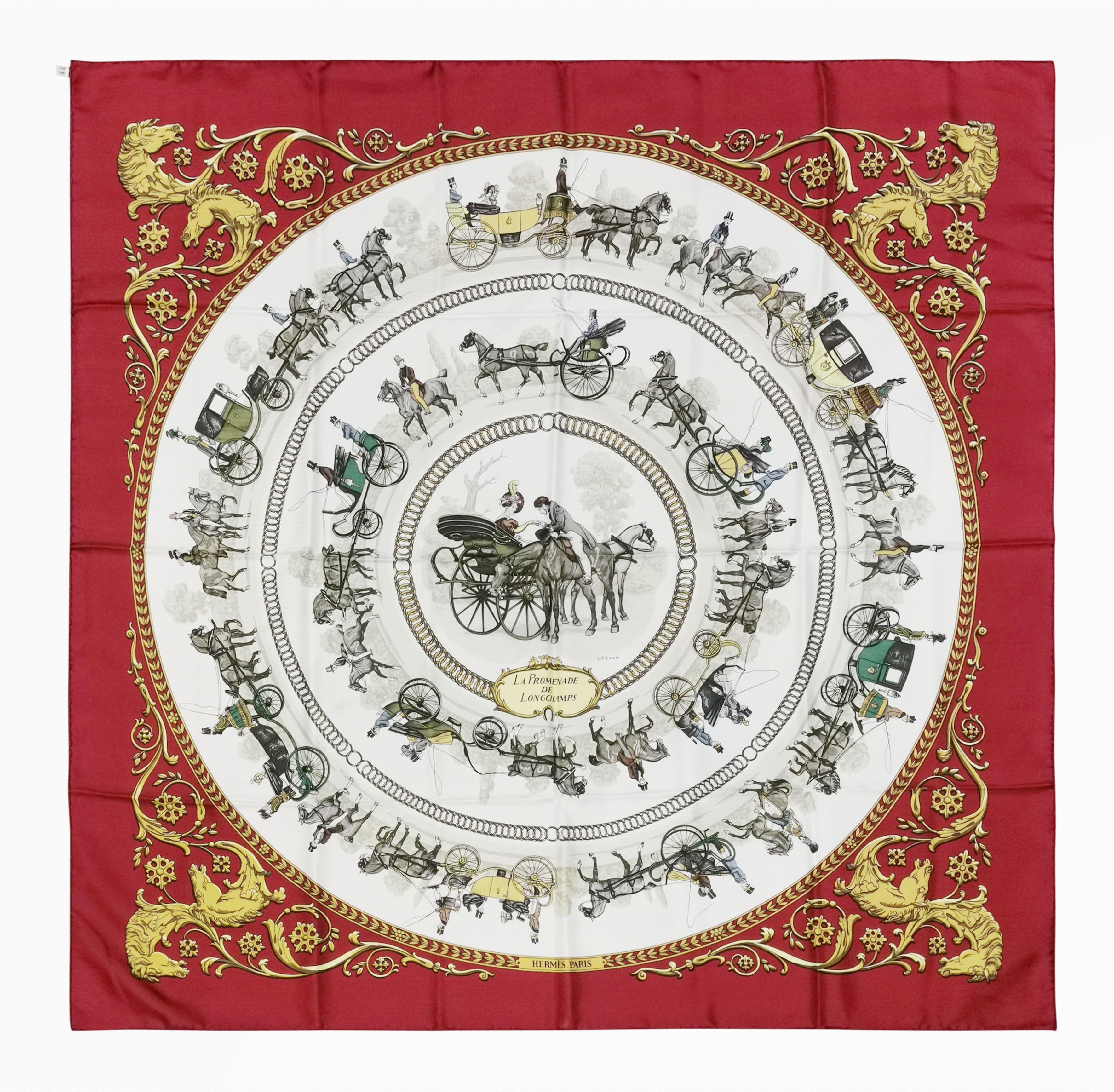 A décor de calèches sur fond ivoire, bordure rouge et dorée, soie, 89x89 cm