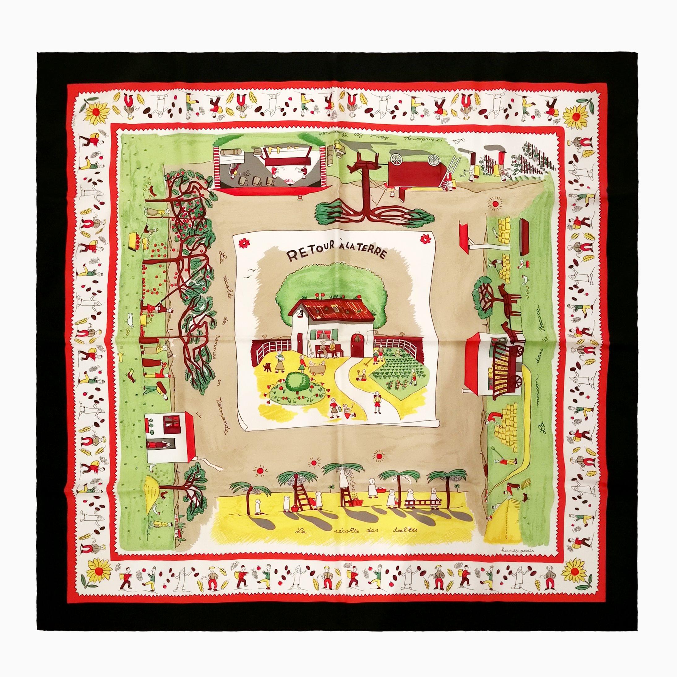 A décor naïf de campagne sur fond vert, blanc et rouge, bordure noire, soie, 88x88 cm. Dans sa boîte