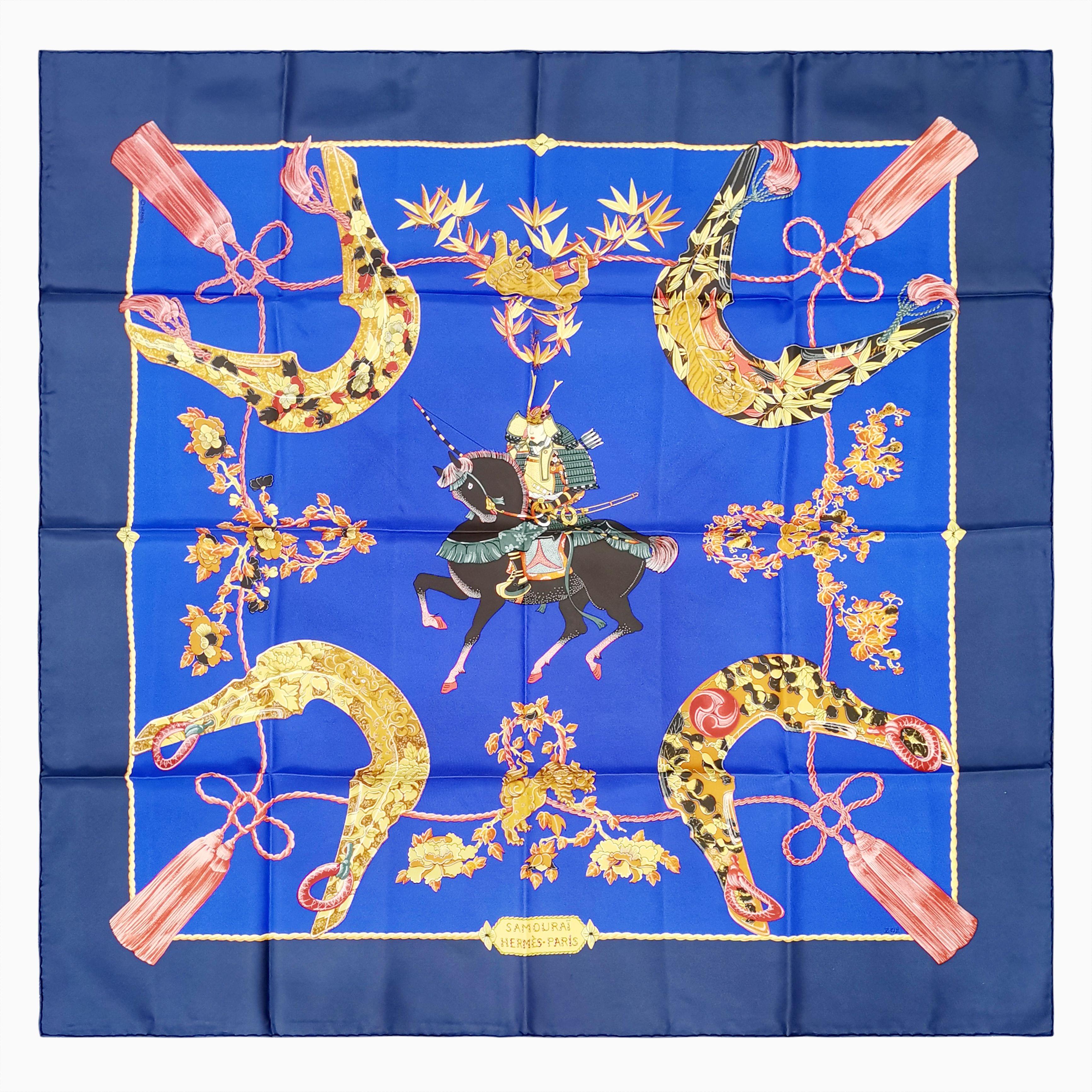 A décor d'un samouraï sur son cheval sur fond bleu et bordure bleu marine, soie, 88x88 cm. Provenance : collection Marisa Perret-Rezzonico