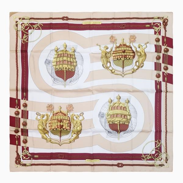 Le premier à décor d'attelages sur fond ivoire et bordure bordeaux et le deuxième à décor de proues de navire sur fond saumon, soie, 88x88 cm