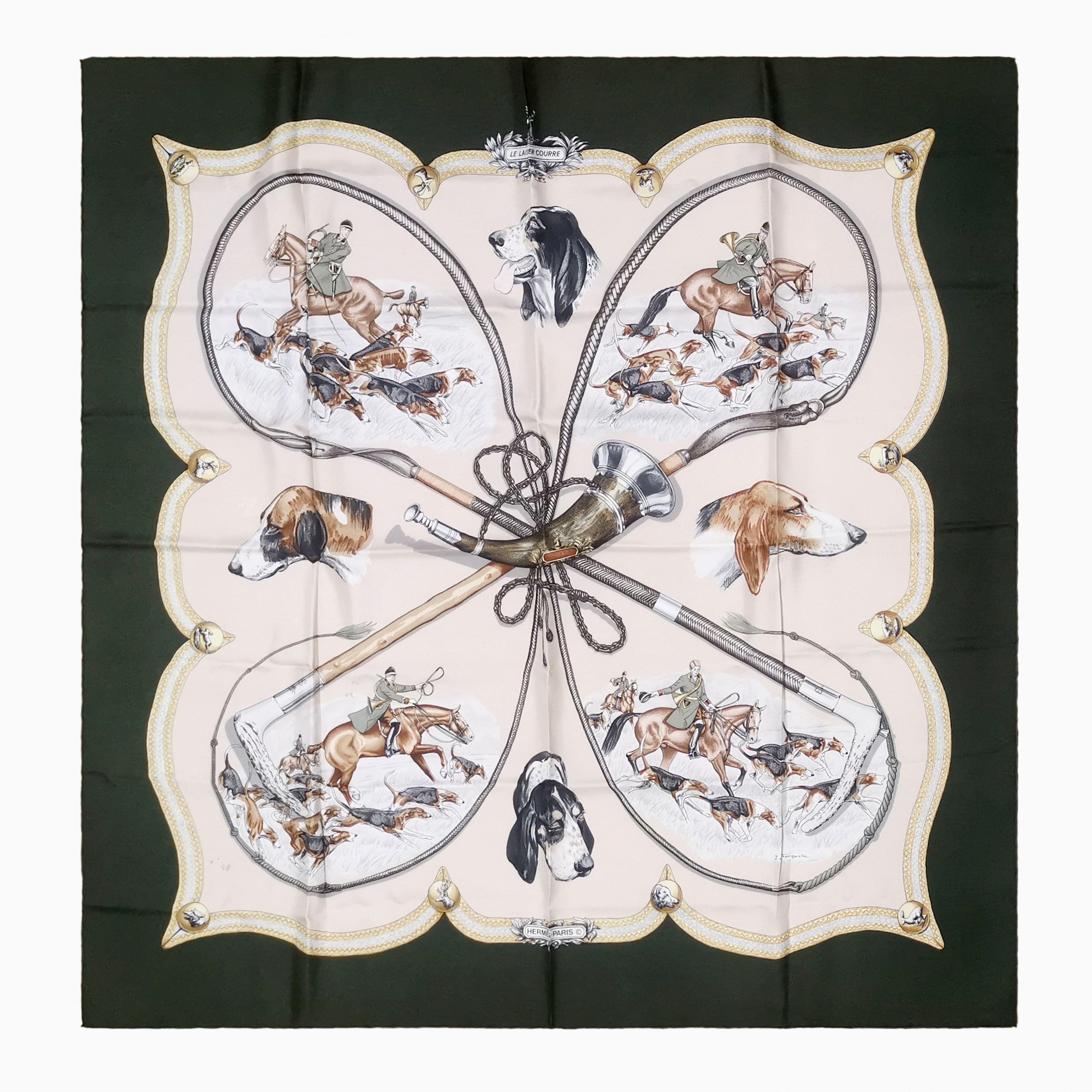 Le premier à décor de cavaliers sur fond ivoire et bordure bleu marine et le deuxième à décor de chiens de chasse sur fond beige et bordure verte, soie, 88x88 cm