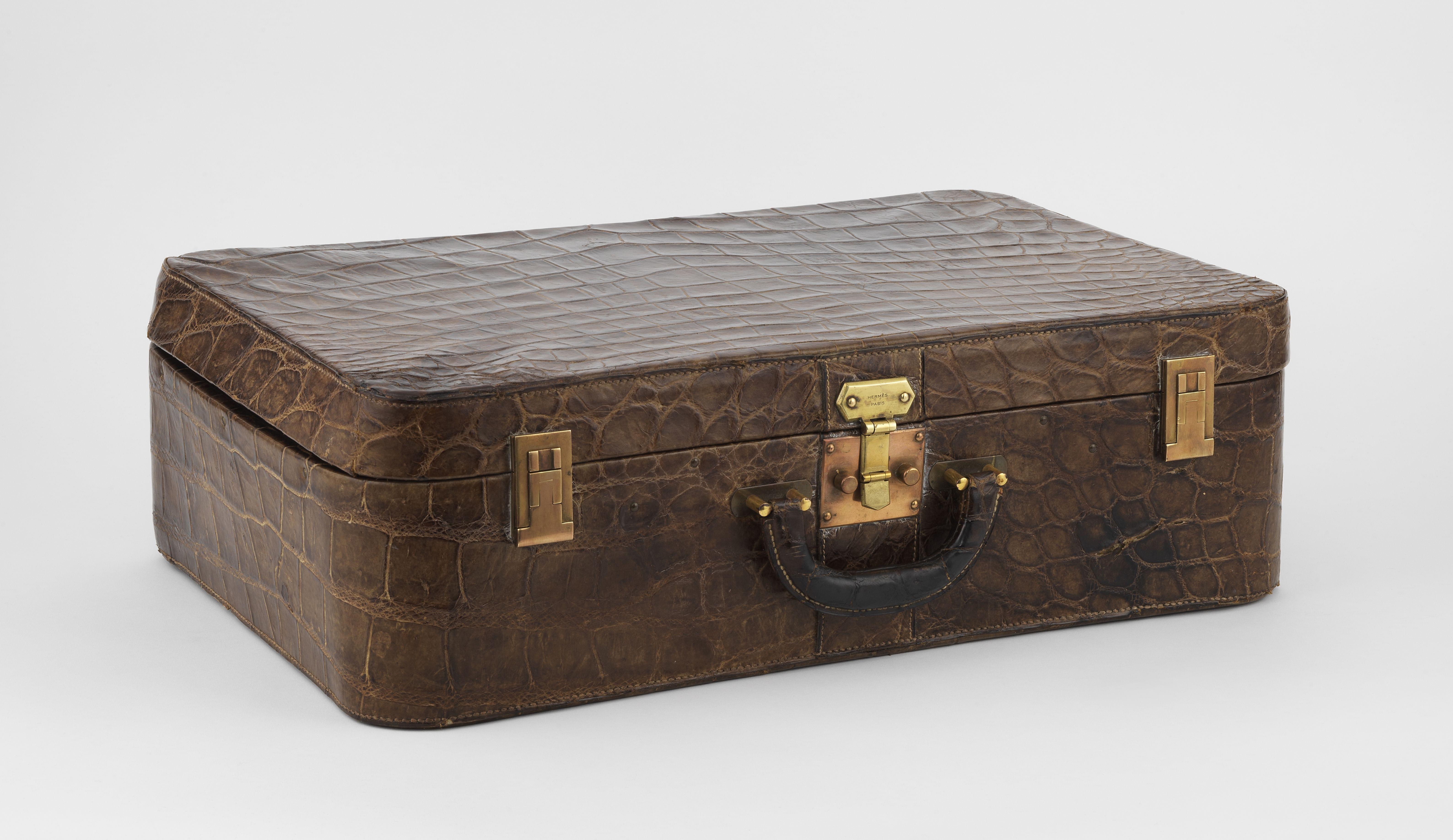 Crocodile chocolat, intérieur en toile beige, garniture en métal doré avec initiales FF, 52x16x38 cm