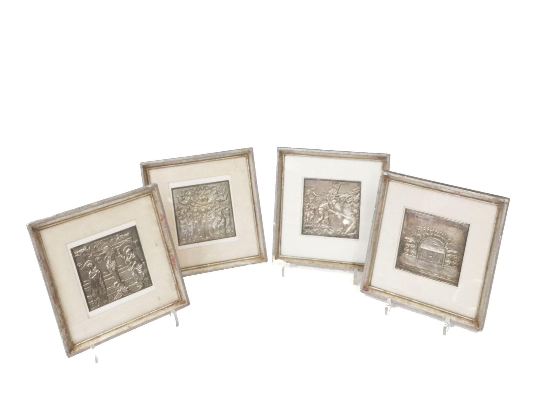 Quatre médaillons carrés bas-relief, argent, 9x9 cm