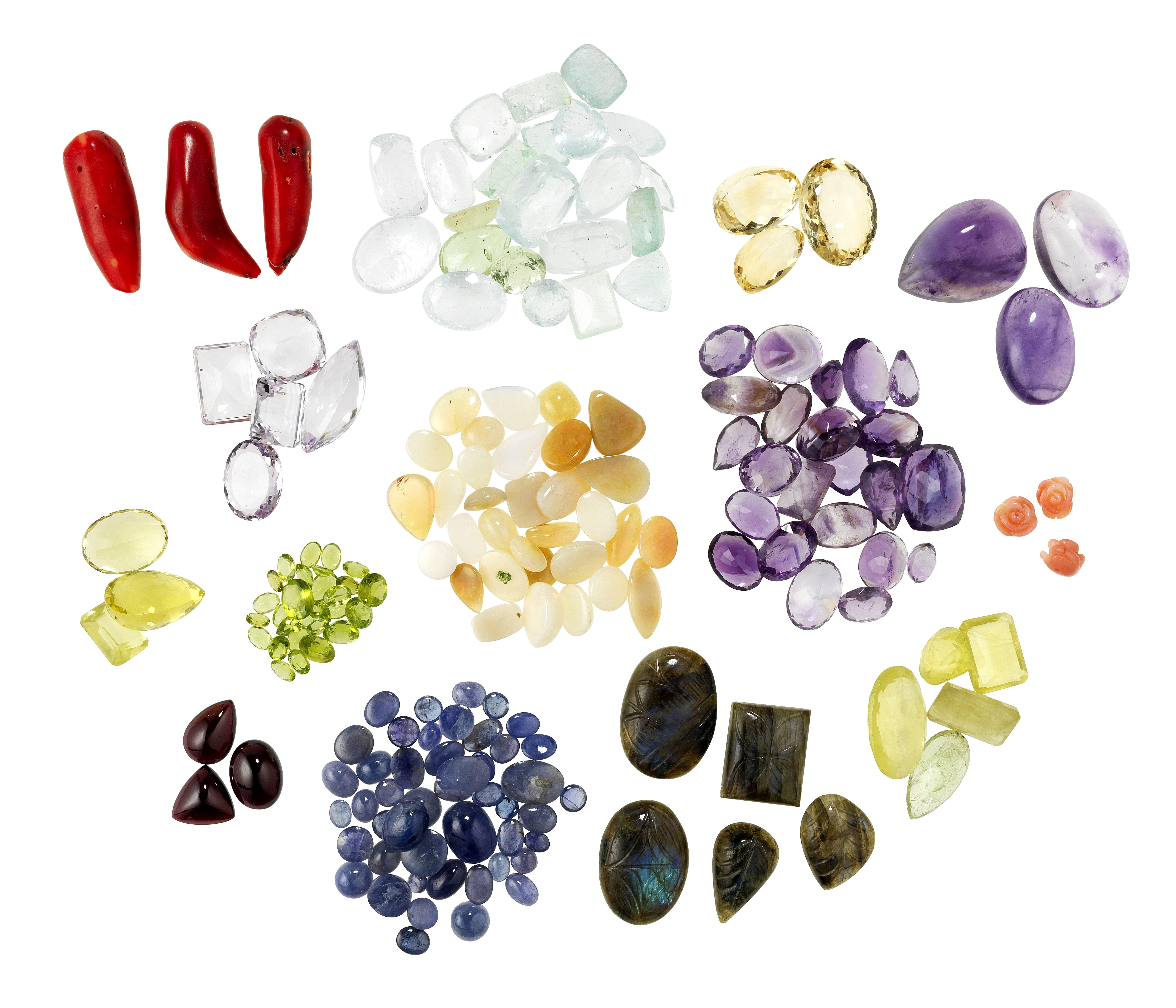 Un lot d'améthystes facettées et taille cabochon (total env. 525 ct), un lot d'opales taille cabochon (env. 125 ct), trois citrines taille ovale (env. 97 ct) et trois citrines lemon (env. 66 ct), un lot de tanzanites taille cabochon (env. 150 ct), un lot d'aigues-marines facettées (env. 300 ct), un lot de péridots facettés (env. 30 ct), un lot d'héliodores facettés (env. 100 ct), trois grenats taille cabochon (env. 41 ct), cinq pièces de labradorites sculptées (env. 158 ct), trois pièces de corail rouge (env. 166 ct) et trois roses en corail rose sculpté (env. 14 ct). Pour les lots précédés d'un *, la TVA de 7,7% est due sur l'entier du prix d'adjudication.