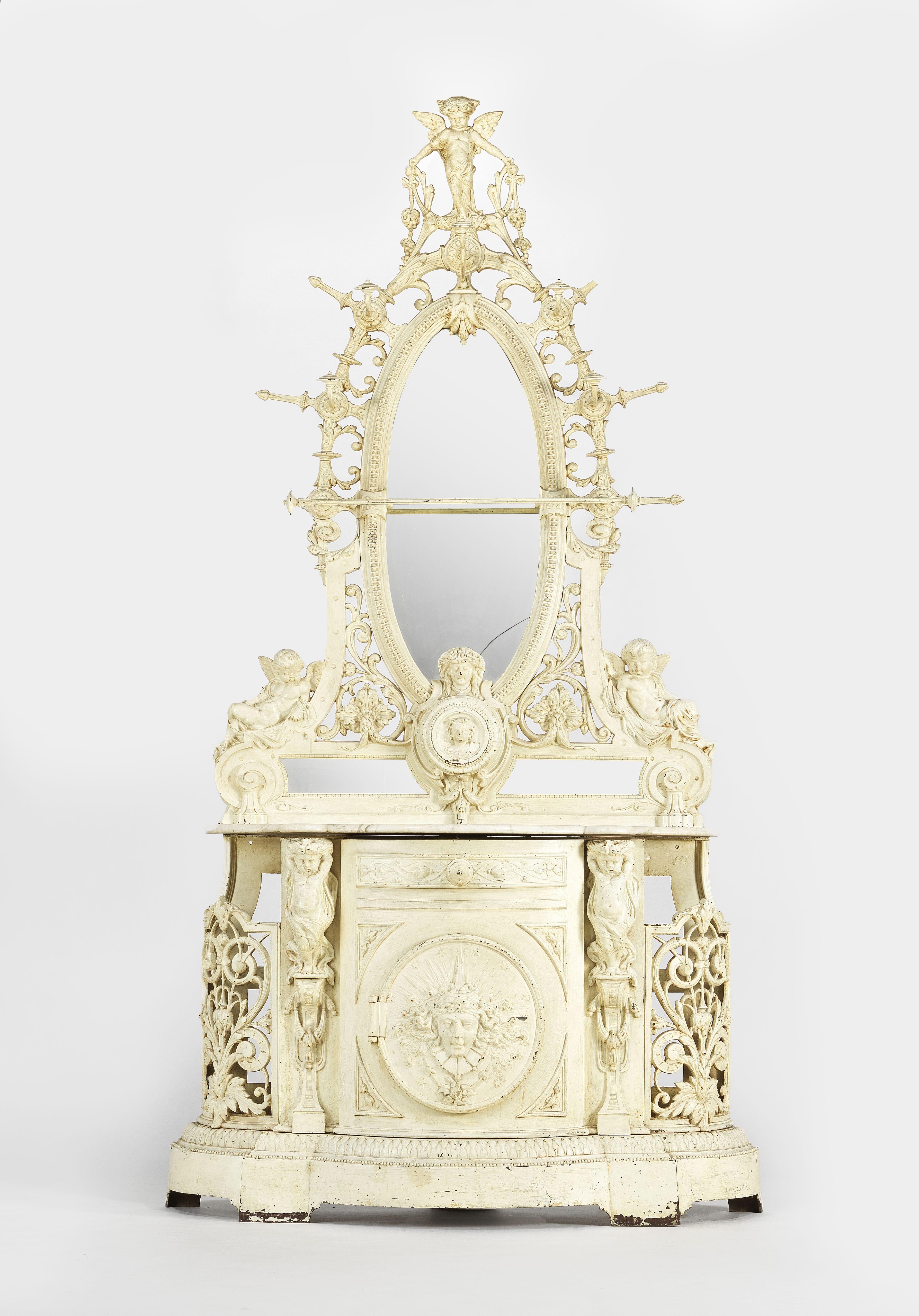 Fonte laquée blanc, marbre, un tiroir et une porte, deux rangements latéraux, 260x120x45 cm
