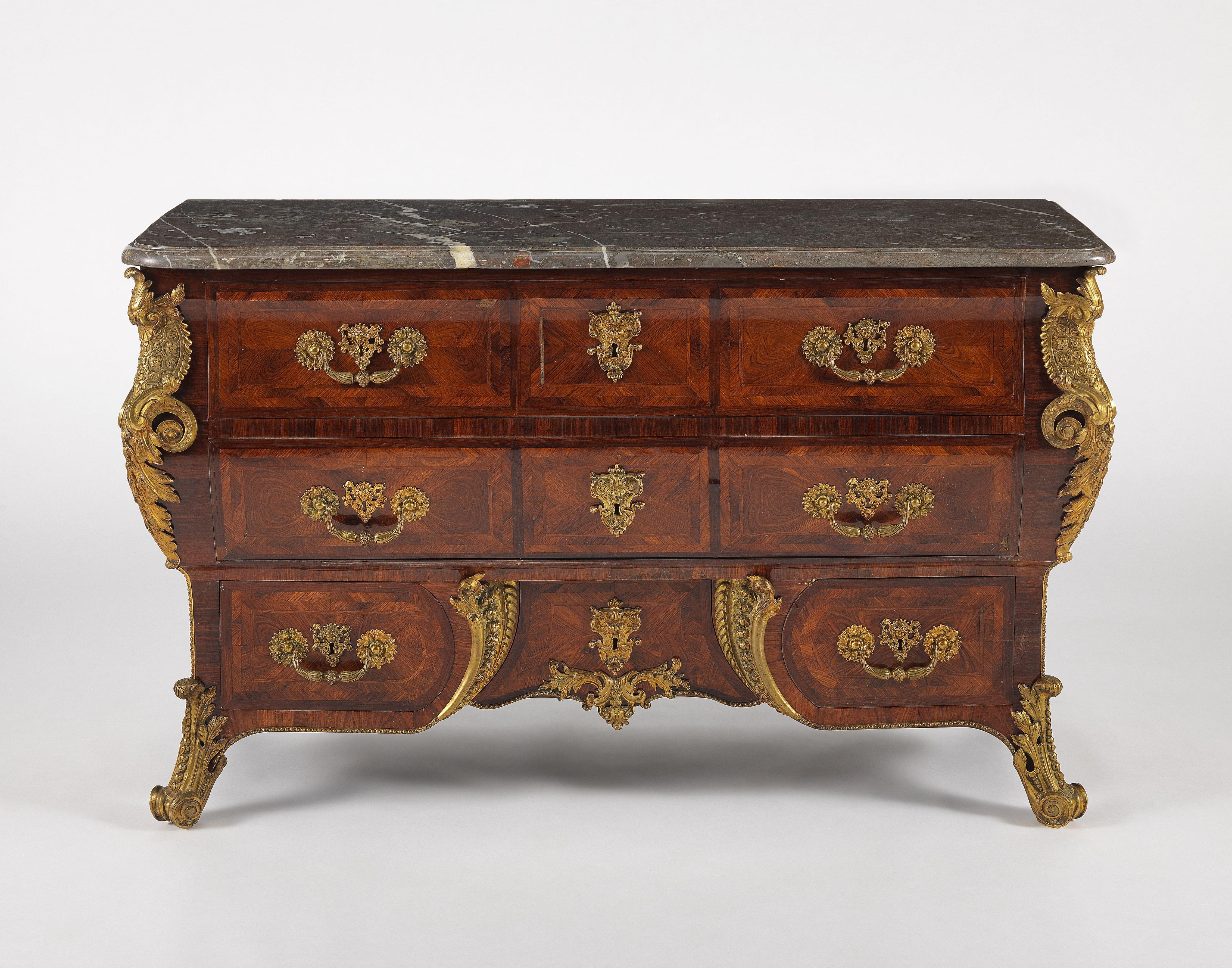Trois tiroirs, bois de rose et bois de violette, marbre, bronze...