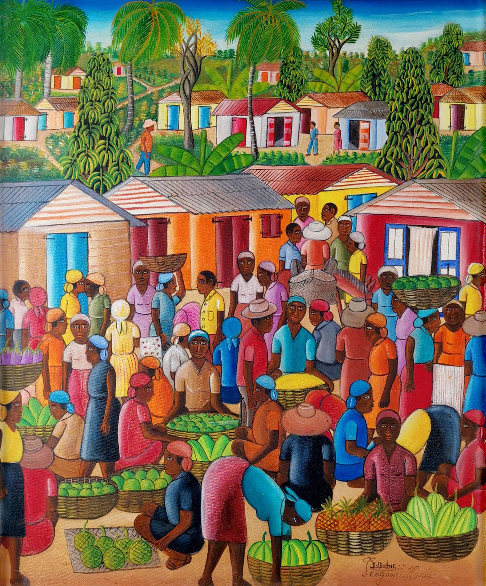 Scène de marché, huile sur toile signée, 62x50 cm
