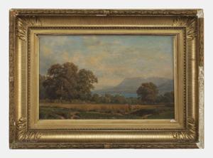 Vue du village de Crans depuis Céligny, huile sur toile, signée, 32x52 cm