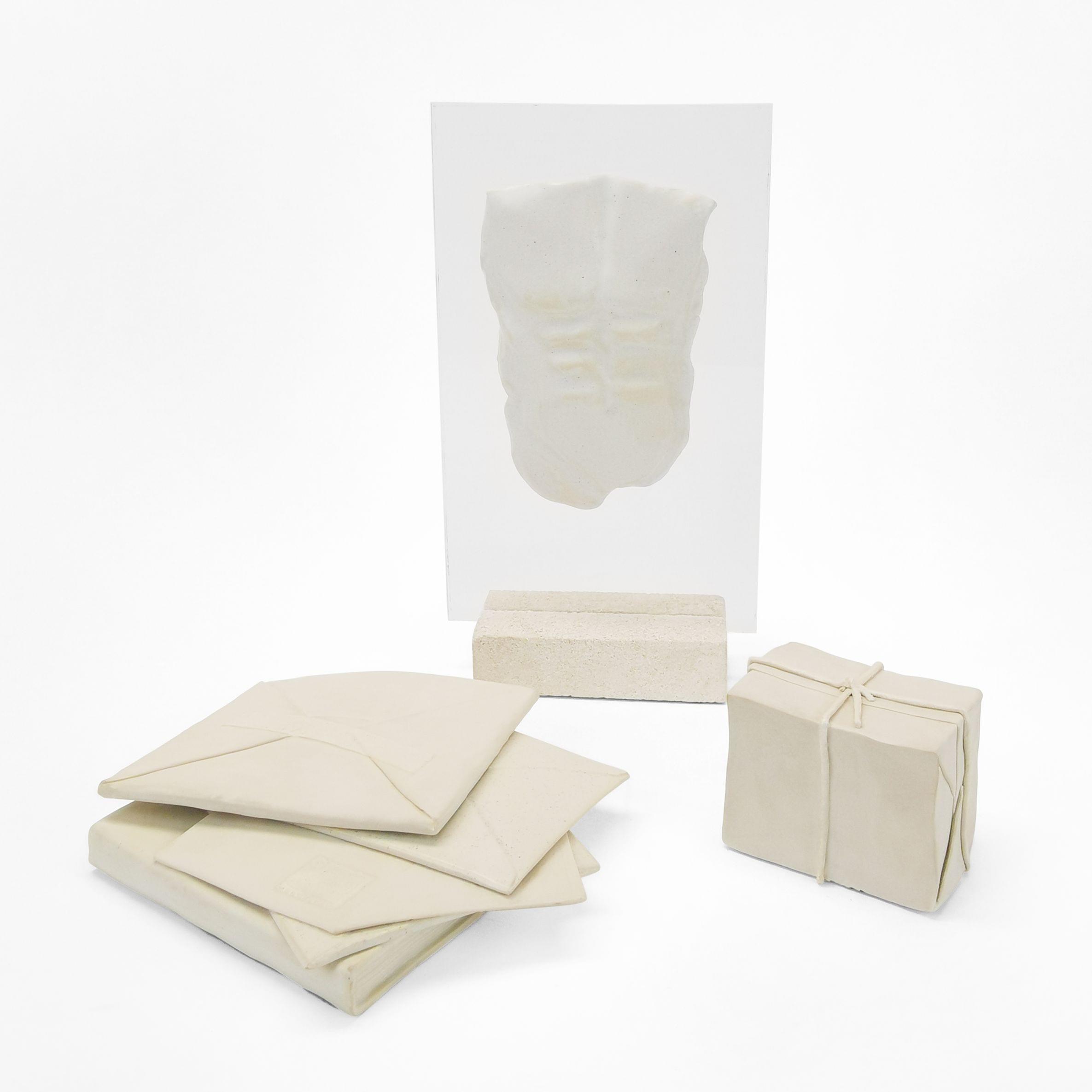 Trois biscuits figurant un torse d'homme, un paquet et une pile de lettres, H 7 à 21 cm