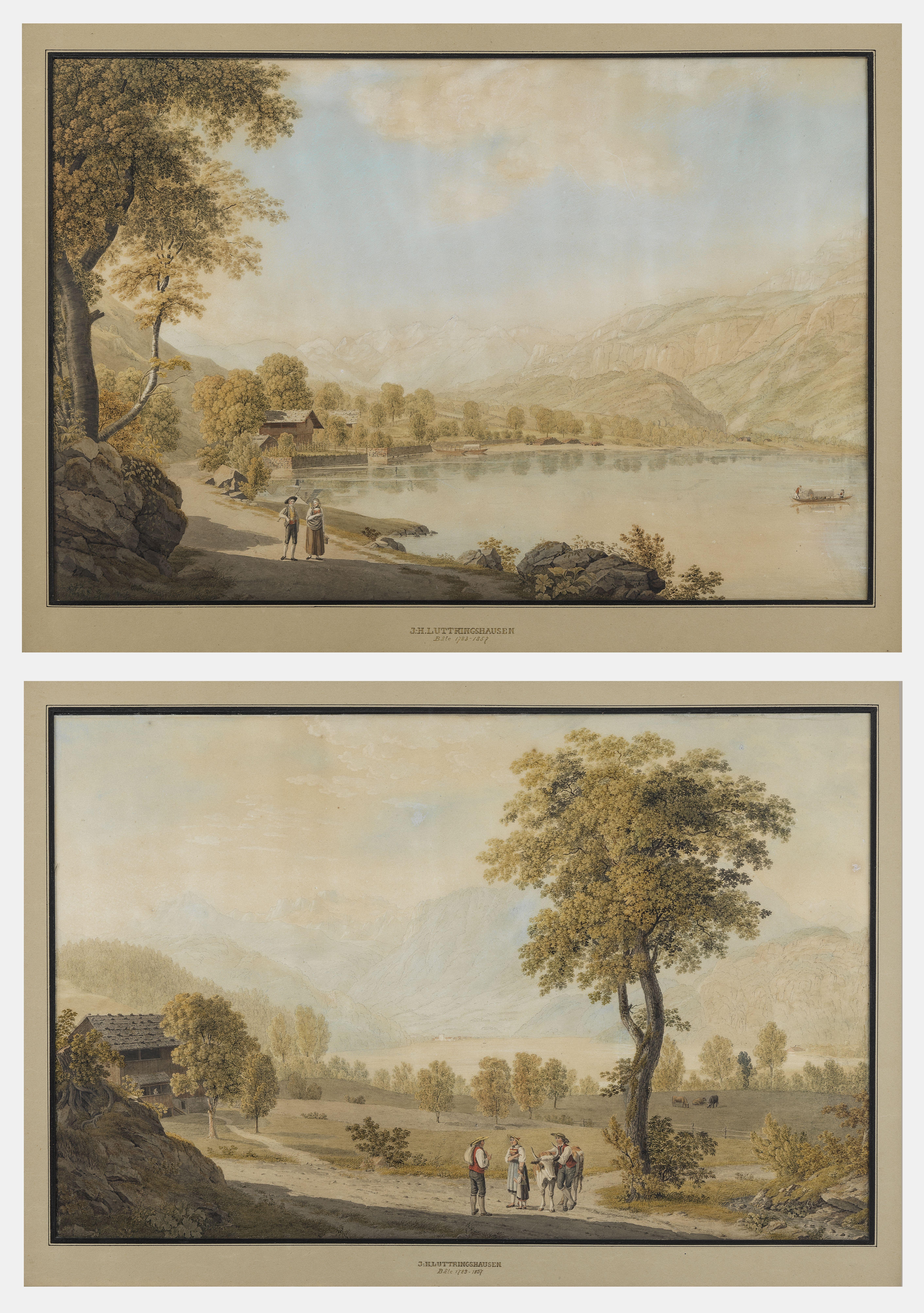 Paire de lavis: vue de lac et montagne et paysans et vache, l'un signé et daté 1813, 44x65 cm