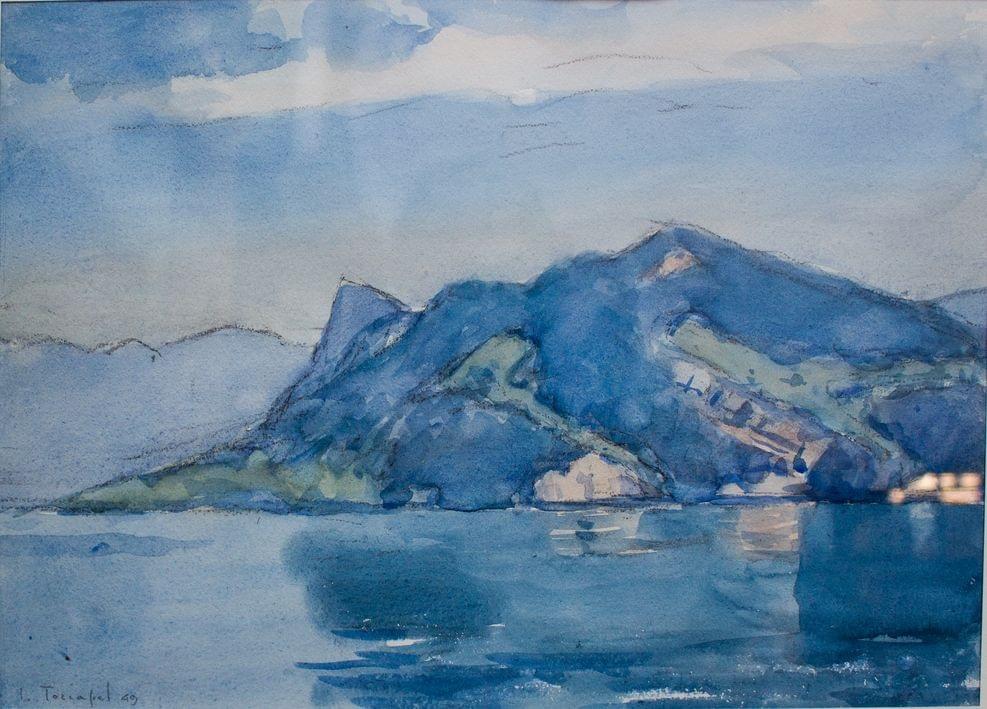 Montagne au bord du lac, aquarelle sur papier signée et datée 49, 27 x 37 cm