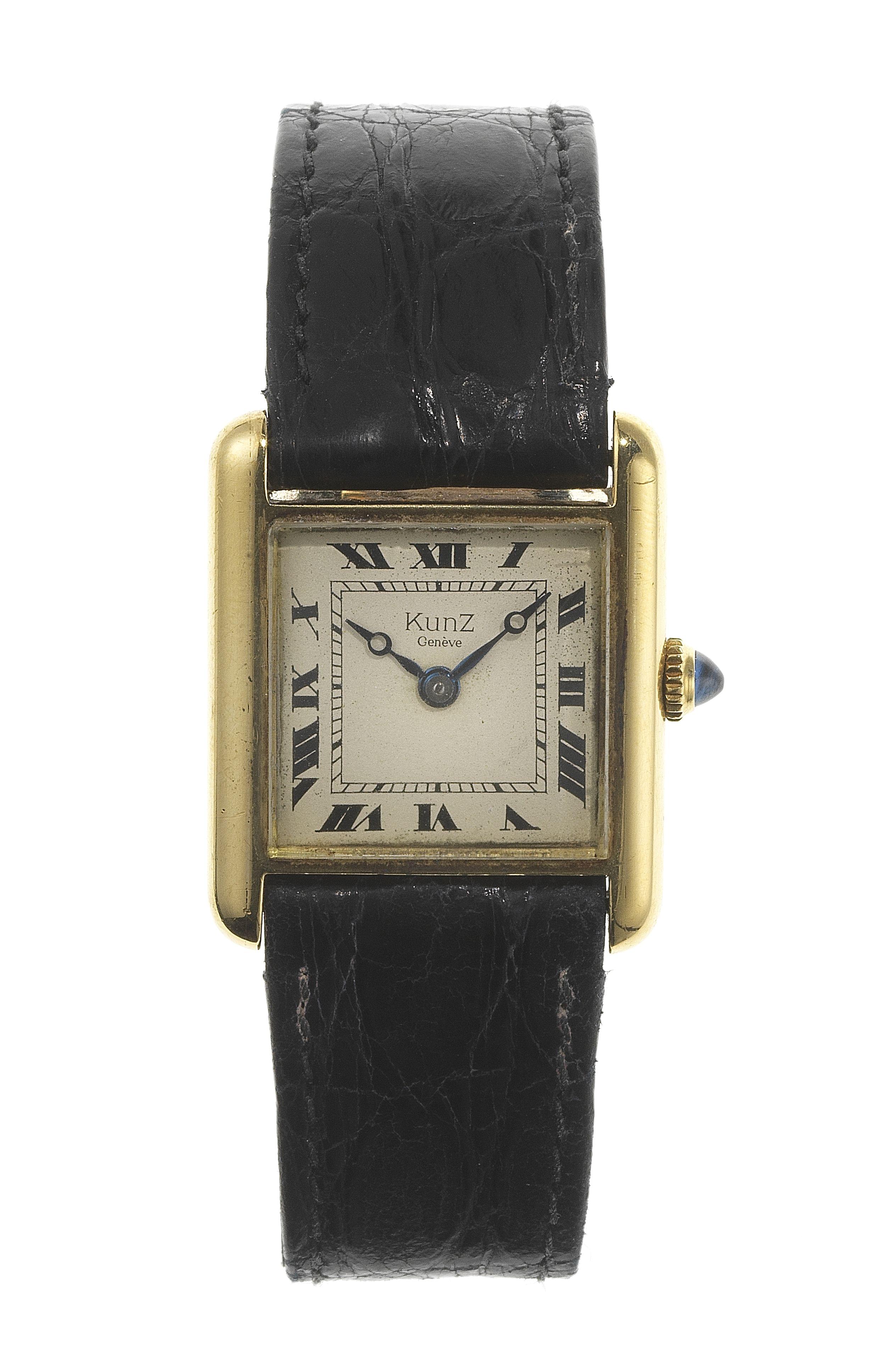 Cadran gris, aiguilles bleuies, chiffres romains noirs, verso gravé d'une couronne comtale et des initiales H.O.C, remontoir serti d'un saphir taille cabochon, boucle déployante, or 750, 28x24 mm, poids brut 33 g
