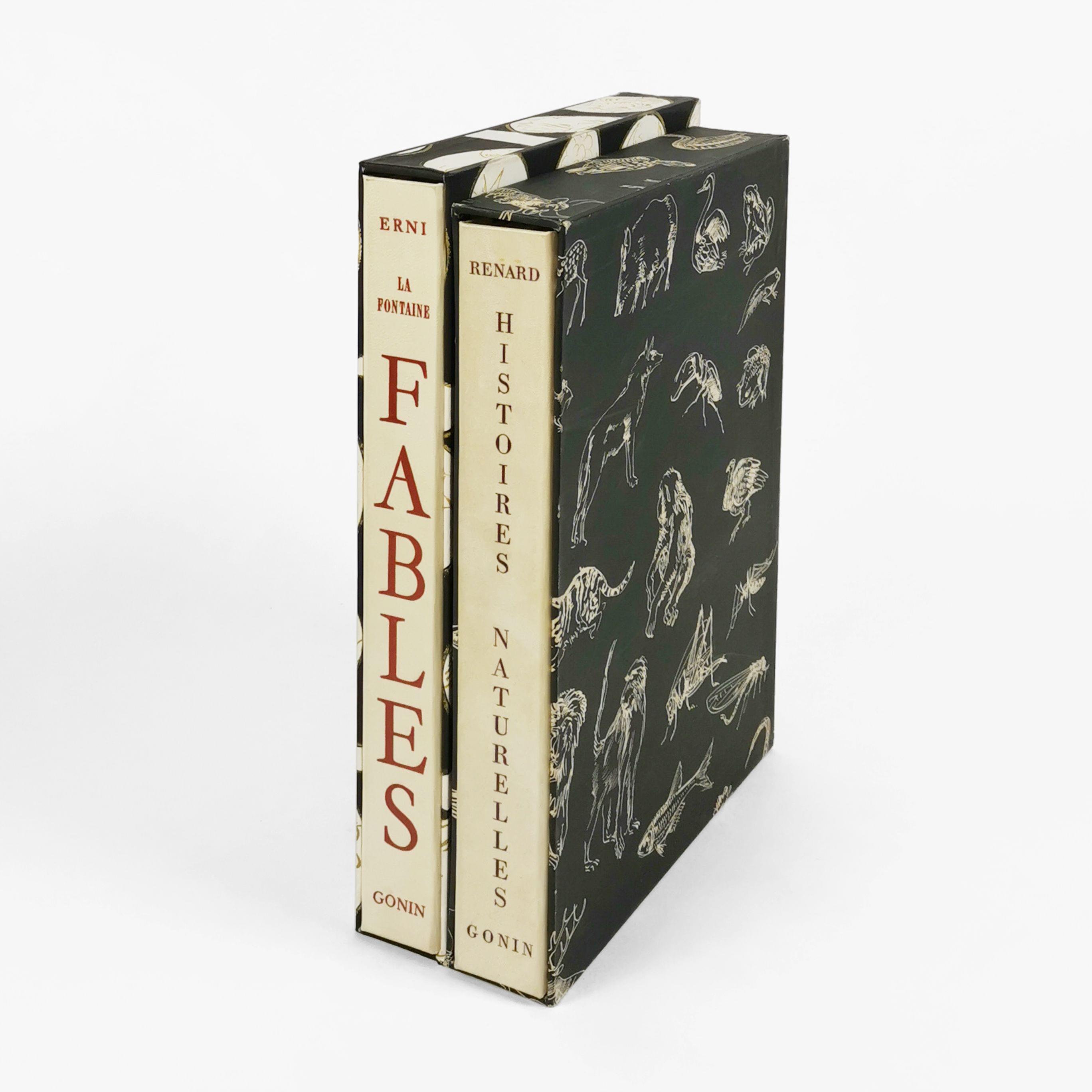 On joint: – RENARD (Jules) – ERNI (Hans) : Histoires Naturelles. Lausanne, André Gonin, 1953 ; in folio en feuilles sous chemise et double emboîtage. Edition illustrée de lithographies en couleurs par Hans Erni. Ex. num. 220, signé par l’artiste et l’éditeur.