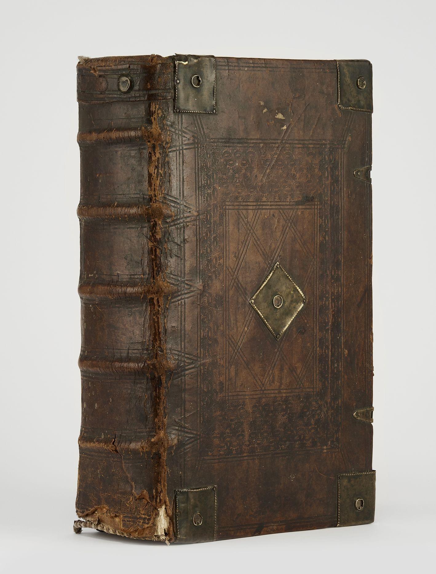 in folio, veau brun à riche décor estampé sur le dos et les plats, cabochons d'angle et central en laiton doré.