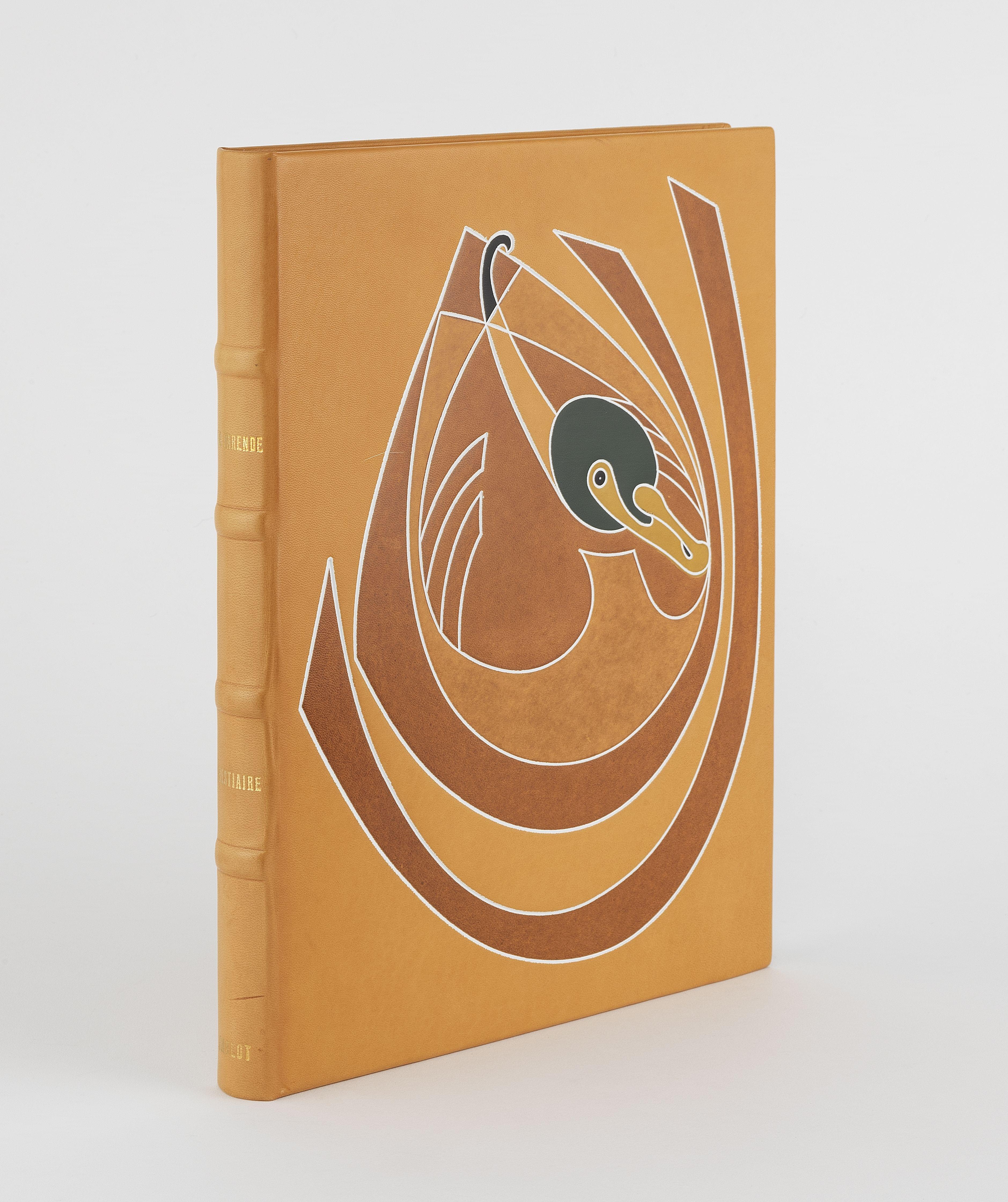 In folio, veau glacé havane, à décor sur le plat supérieur d'un canard en veau mosaïqué, tête dorée, étui.Illustré de lithographies originales d'Abel Imblot.Edition tirée à 199 exemplaires, celui-ci, sur vélin de Rives.