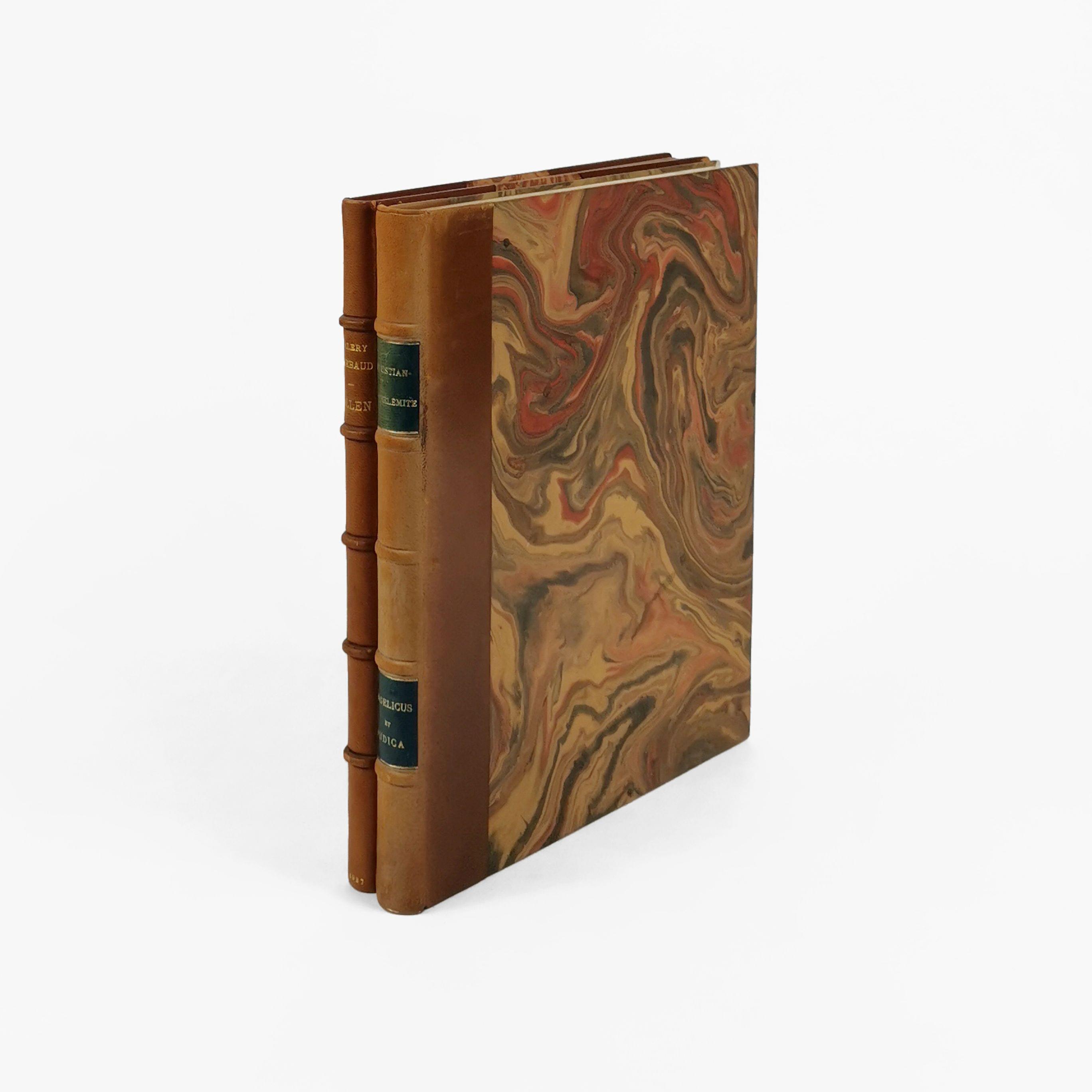 In 4°, demi-basane fauve, dos à nerfs, pièces de titre en veau bleu, couvertures conservés. Belle illustration en sanguine d’Othon COUBINE, artiste d’origine tchèque. Edition originale tirée à 120 ex. numérotés seulement ; celui-ci est un des 113 sur vieux papier de Hollande Van Gelder. Joint : CHRISTIAN-LE-THELEMITE : Angelicus et Pudica. Paris, La Renaissance Universelle, 1921 ; in 4°, demi-basane fauve, couvertures conservés. Ill. de C. HEROUARD.