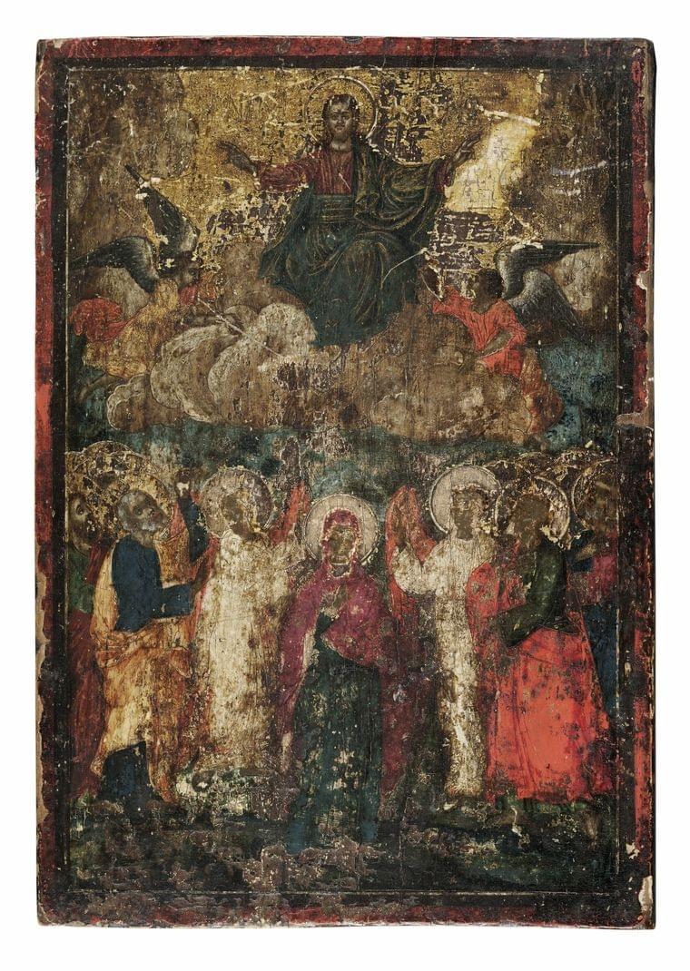 Icône russe, tempera sur panneau, calice en relief sur la couche...