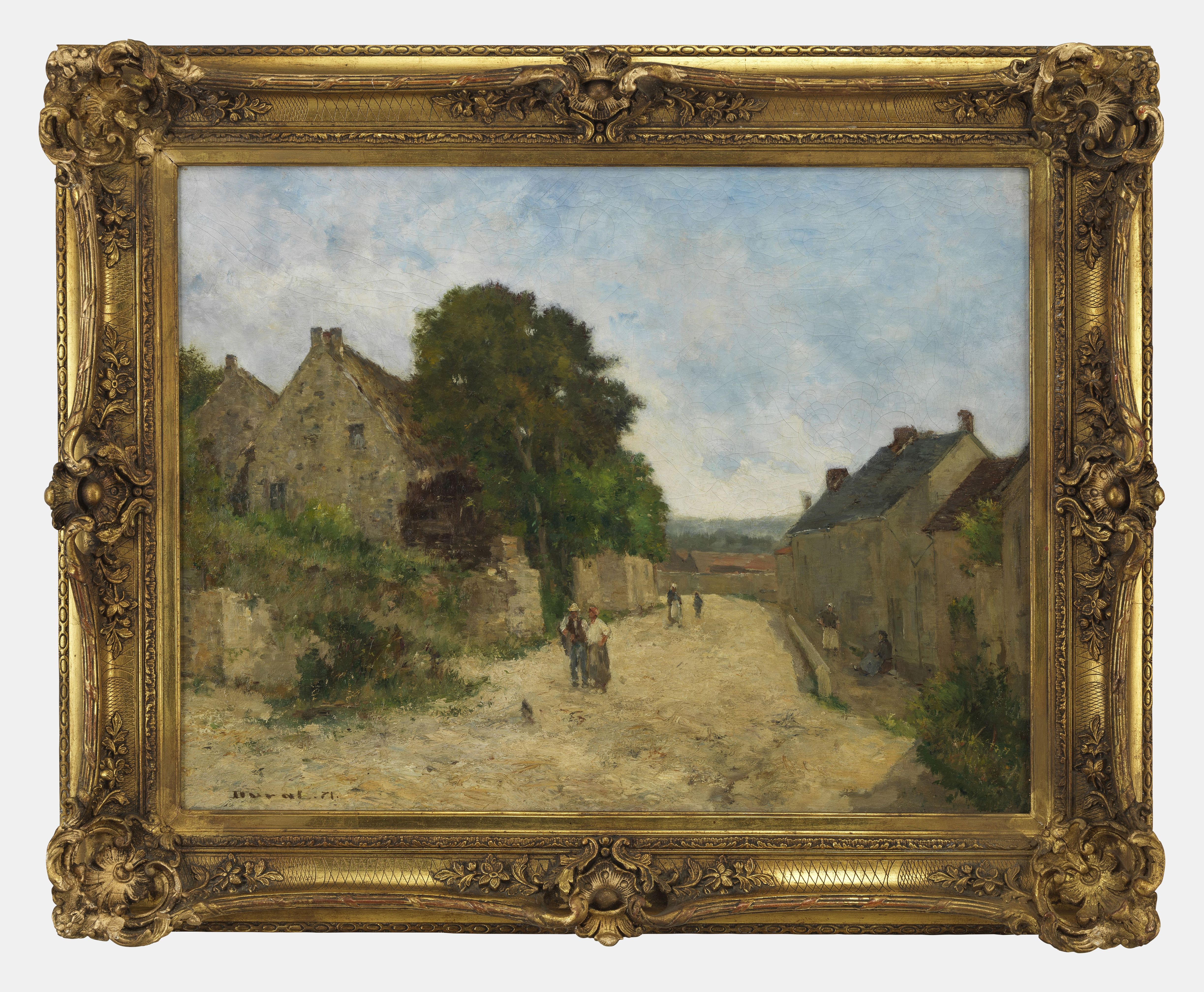 Paysage animé à la chaumière, huile sur toile, signée, 48x58 cm