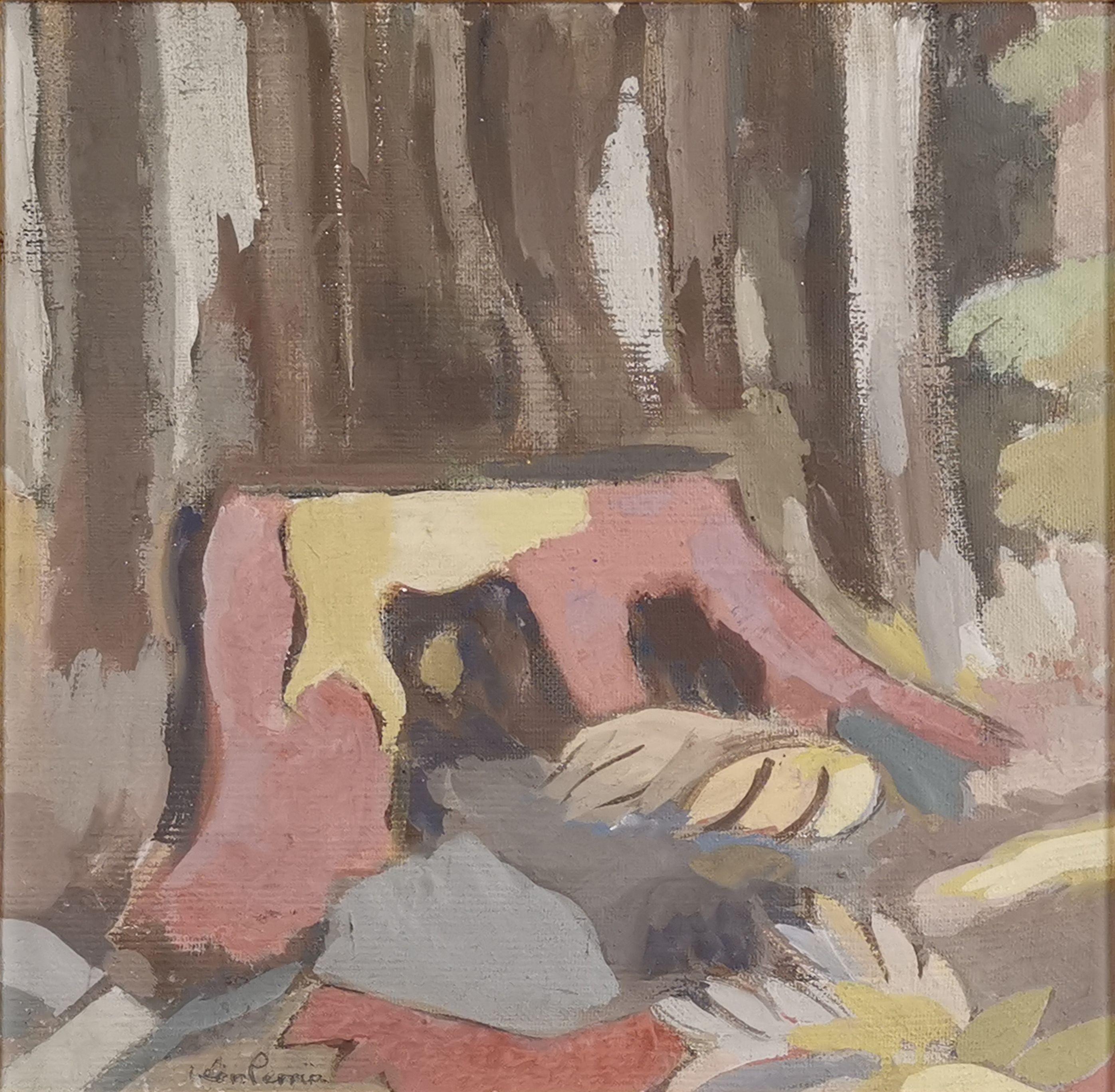 Enfants patinant sur la rivière, huile sur toile, signée, 44,5x7...