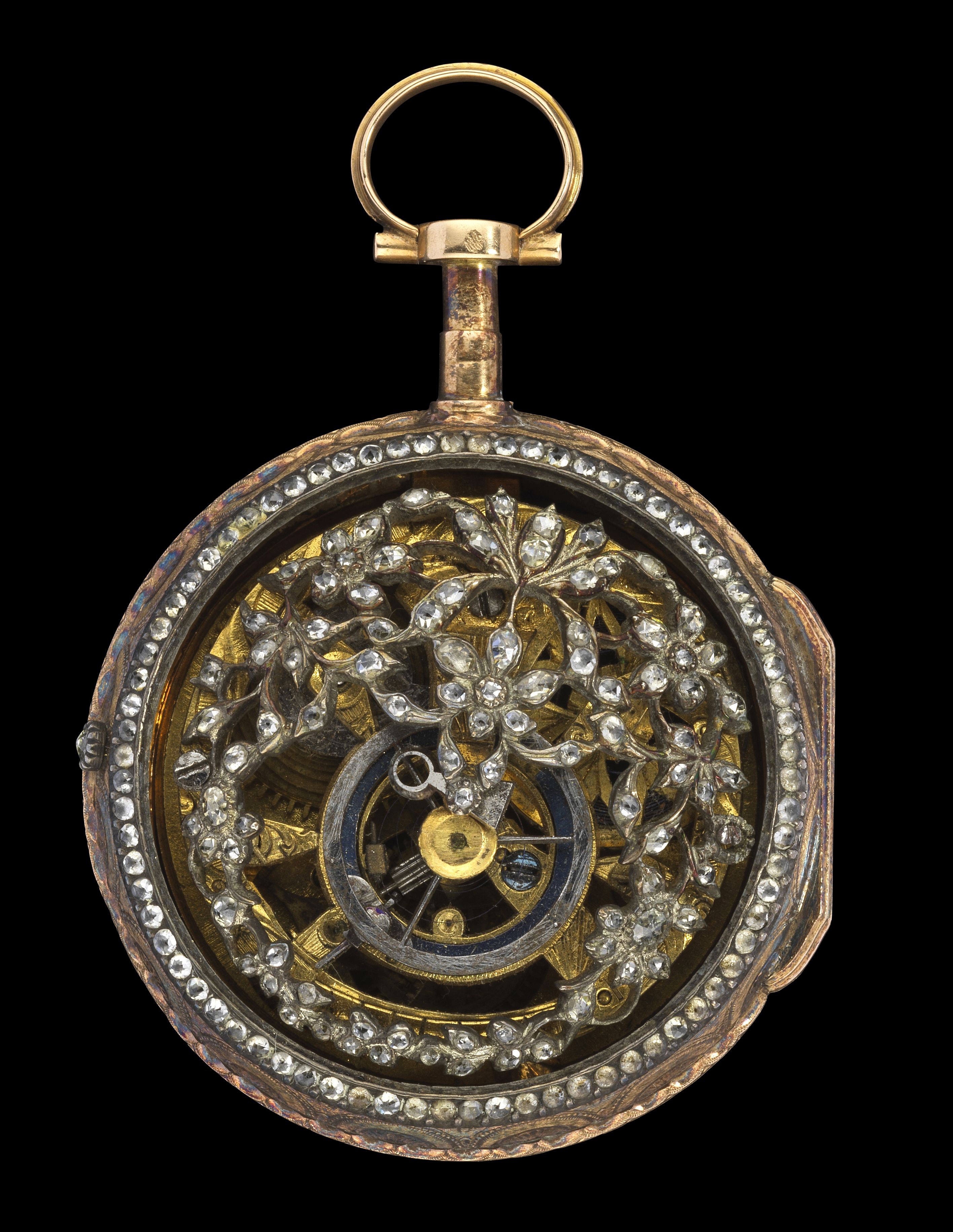 Cadran émaillé blanc, aiguilles et chiffres romains noirs, mouvement orné d'un décor ajouré et serti de pierres d'imitation, laiton, D 38 mm